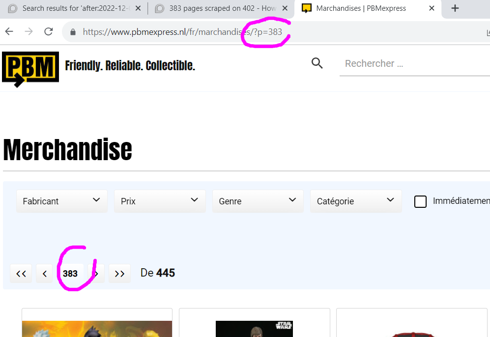 I'm trying to scrap a new website from only one category. The scrap works fine but stopped in the middle of page 383. There are 402 pages in this category. As the scraping is very long, I wish to scrap only the last pages. So is it possible to create a new start with a page number ? The pagination displays only one page number and a next link, like that : <<(first) <(previous) 383 >(next) >> (last)