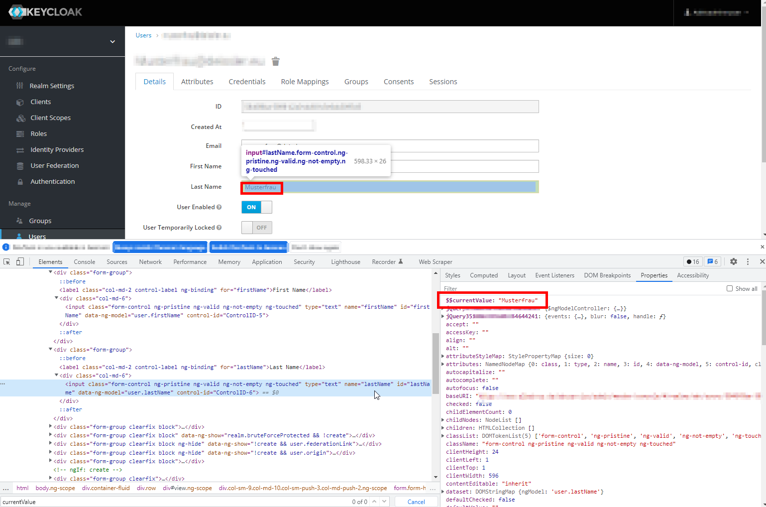 Via the console I could also call the value with "document.querySelector("#lastName").$$currentValue".