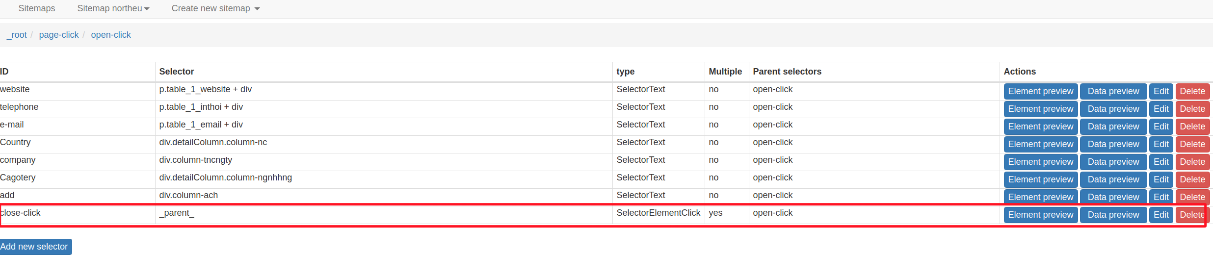 {"_id":"northeu","startUrl":["https://vietnordic.com/doanh-nghiep/"],"selectors":[{"id":"open-click","type":"SelectorElementClick","parentSelectors":["page-click"],"selector":"parent","multiple":true,"delay":"500","clickElementSelector":"td img","clickType":"clickOnce","discardInitialElements":"discard-when-click-element-exists","clickElementUniquenessType":"uniqueCSSSelector"},{"id":"website","type":"SelectorText","parentSelectors":["open-click"],"selector":"p.table_1_website + div","multiple":false,"regex":"","delay":0},{"id":"page-click","type":"SelectorElementClick","parentSelectors":["_root"],"selector":"html","multiple":true,"delay":2000,"clickElementSelector":"div#table_1_paginate span a:not(:contains('128')):nth-of-type(-n+3)","clickType":"clickOnce","discardInitialElements":"discard-when-click-element-exists","clickElementUniquenessType":"uniqueCSSSelector"},{"id":"telephone","type":"SelectorText","parentSelectors":["open-click"],"selector":"p.table_1_inthoi + div","multiple":false,"regex":"","delay":0},{"id":"e-mail","type":"SelectorText","parentSelectors":["open-click"],"selector":"p.table_1_email + div","multiple":false,"regex":"","delay":0},{"id":"close-click","type":"SelectorElementClick","parentSelectors":["open-click"],"selector":"parent","multiple":true,"delay":"500","clickElementSelector":".wdt-md-modal span","clickType":"clickOnce","discardInitialElements":"discard-when-click-element-exists","clickElementUniquenessType":"uniqueCSSSelector"},{"id":"Country","type":"SelectorText","parentSelectors":["open-click"],"selector":"div.detailColumn.column-nc","multiple":false,"regex":"","delay":0},{"id":"company","type":"SelectorText","parentSelectors":["open-click"],"selector":"div.column-tncngty","multiple":false,"regex":"","delay":0},{"id":"Cagotery","type":"SelectorText","parentSelectors":["open-click"],"selector":"div.detailColumn.column-ngnhhng","multiple":false,"regex":"","delay":0},{"id":"add","type":"SelectorText","parentSelectors":["open-click"],"selector":"div.column-ach","multiple":false,"regex":"","delay":0}]}