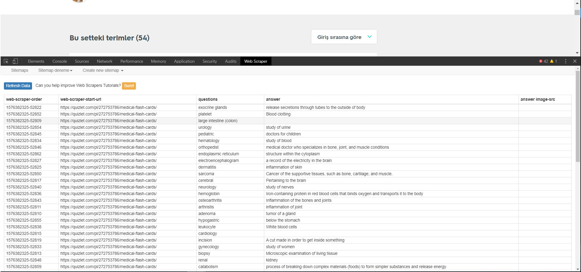 {"_id":"deneme","startUrl":["https://quizlet.com/pl/272753786/medical-flash-cards/"],"selectors":[{"id":"cards","type":"SelectorElement","parentSelectors":["_root"],"selector":"div.SetPageTerm-content","multiple":true,"delay":0},{"id":"questions","type":"SelectorText","parentSelectors":["cards"],"selector":".SetPageTerm-wordText span","multiple":false,"regex":"","delay":0},{"id":"answer","type":"SelectorText","parentSelectors":["cards"],"selector":"a.SetPageTerm-definitionText","multiple":false,"regex":"","delay":0},{"id":"answer image","type":"SelectorImage","parentSelectors":["cards"],"selector":"img","multiple":false,"delay":0}]}