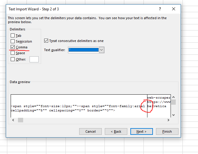 One can immediately see the problem. For the following .csv file using commas as delimiters, the commas inside the style attribute separating font families are being wrongly read is a delimiter, causing html to be delimited at that point.