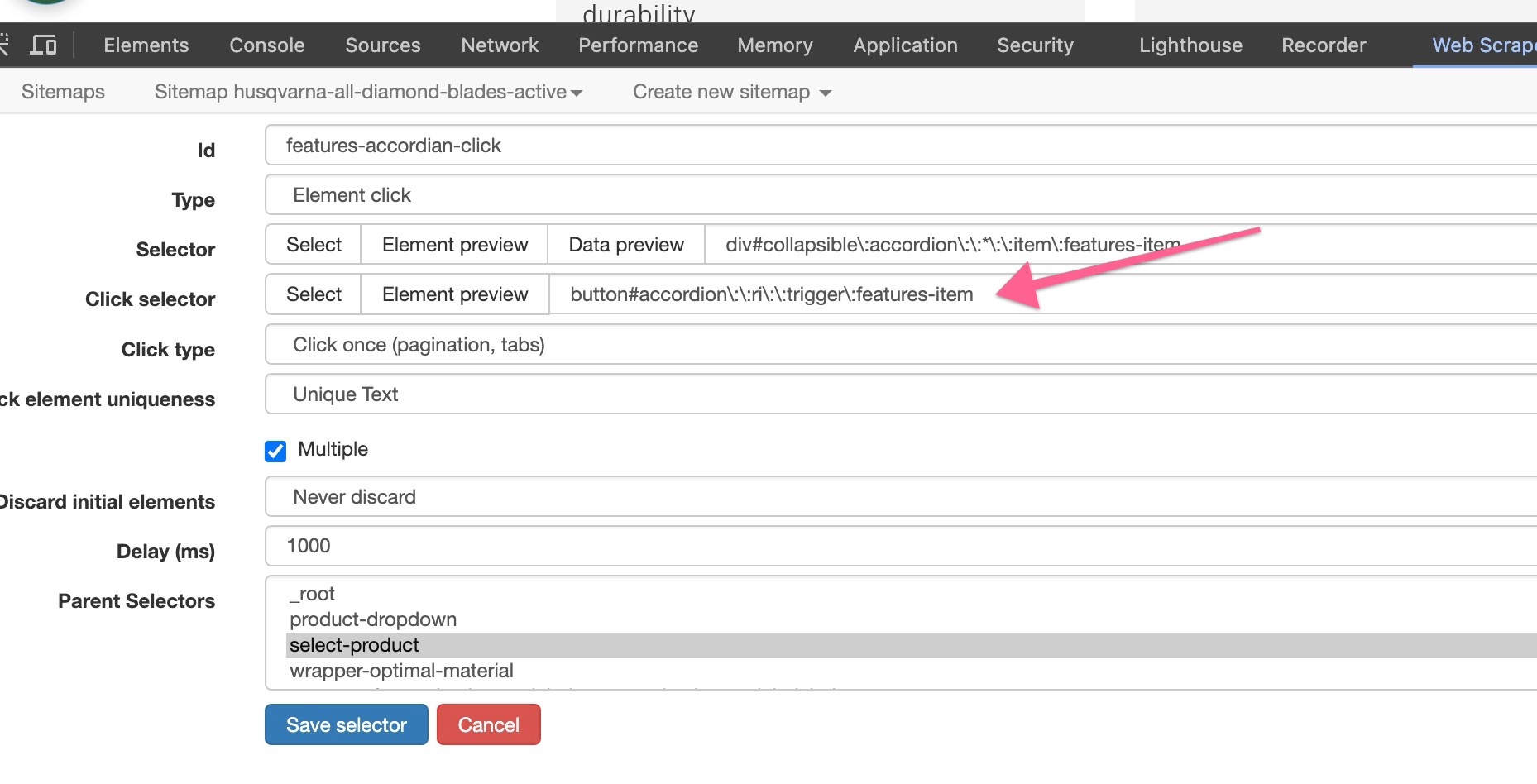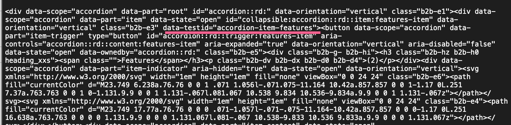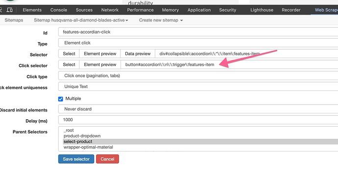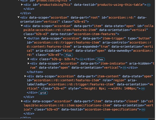 I chose this element from the page I was working on only to see that it doesn't work on other product pages: div#collapsible:accordion::r9::item:features-item