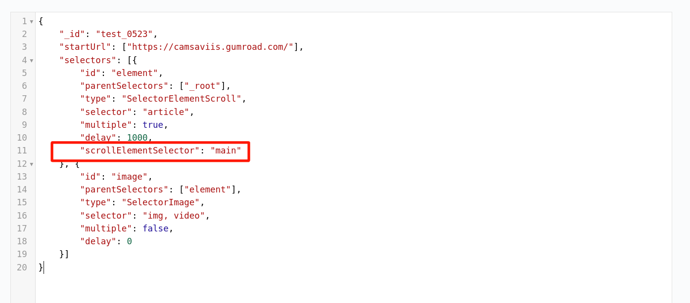 {"_id":"test_0523","startUrl":["https://camsaviis.gumroad.com/"],"selectors":[{"delay":30000,"id":"element","multiple":true,"parentSelectors":["_root"],"selector":"article","type":"SelectorElementScroll"},{"delay":0,"id":"image","multiple":false,"parentSelectors":["element"],"selector":"img","type":"SelectorImage"}]}