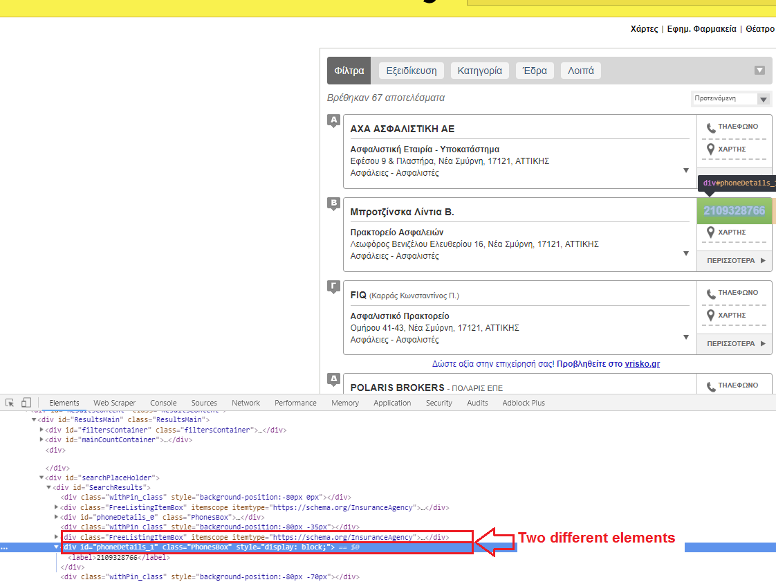 {"_id":"vriskonew","startUrl":["https://www.vrisko.gr/search/Ασφάλειες-Ασφαλιστές/Νέα-Σμύρνη-ΑΤΤΙΚΗΣ/"],"selectors":[{"id":"Element","type":"SelectorElement","parentSelectors":["_root"],"selector":"div.FreeListingItemBox:nth-of-type(18)","multiple":false,"delay":0},{"id":"onoma","type":"SelectorText","parentSelectors":["Element"],"selector":"a span","multiple":false,"regex":"","delay":0},{"id":"phone","type":"SelectorElementAttribute","parentSelectors":["Element"],"selector":"div.PhonesBox","multiple":false,"extractAttribute":"","delay":0}]}