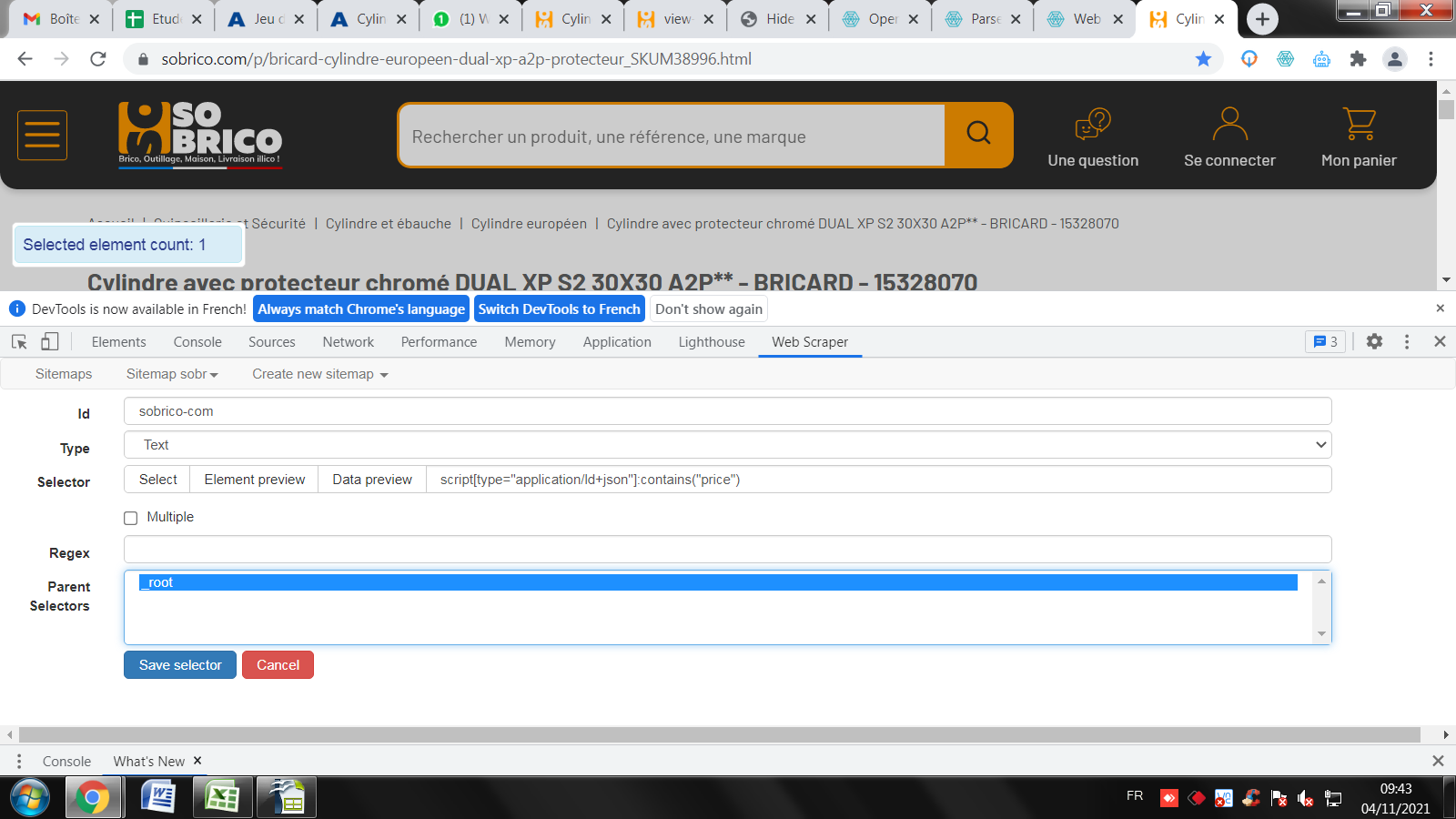 {"_id":"sobrico-com","startUrl":["https://www.sobrico.com/p/vachette-accessoires-cylindres-europeens-vachette_SKUM84233.html"],"selectors":[{"delay":0,"id":"price","multiple":false,"parentSelectors":["_root"],"regex":"","selector":"script[type=\"application/ld+json\"]:contains(\"price\")","type":"SelectorText"}]}