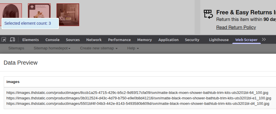 {"_id":"homedepot3","startUrl":["https://www.homedepot.com/p/MOEN-Doux-M-CORE-3-Series-1-Handle-Valve-Trim-Kit-in-Matte-Black-Valve-not-Included-UTS3201BL/314331558"],"selectors":[{"id":"images","multiple":true,"parentSelectors":["click-gallery"],"selector":".thumbnail__wrapper img","type":"SelectorImage"},{"clickActionType":"real","clickElementSelector":".mediagallery__mainimage--clickable","clickElementUniquenessType":"uniqueCSSSelector","clickType":"clickOnce","delay":2000,"discardInitialElements":"do-not-discard","id":"click-gallery","multiple":false,"parentSelectors":["_root"],"selector":".overlay__side-content__product-images","type":"SelectorElementClick"}]}