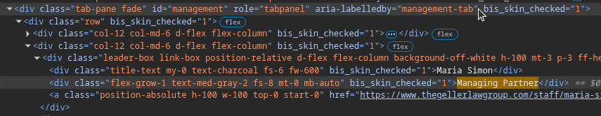 {"_id":"Bestlawfirms","startUrl":["The Geller Law Group in Washington, D.C., VA, US> div.d-flex","type":"SelectorText"},{"clickActionType":"real","clickElementSelector":"button#management-tab","clickElementUniquenessType":"uniqueText","clickType":"clickOnce","delay":2000,"discardInitialElements":"do-not-discard","id":"Contact","multiple":true,"parentSelectors":["_root"],"selector":"a.position-absolute","type":"SelectorElementClick"},{"id":"Contact Person","multipleType":"singleColumnWithSeparator","parentSelectors":["Contact"],"regex":"","selector":"parent","type":"SelectorText"}]}