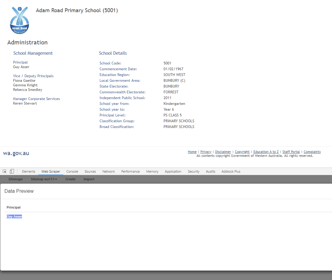 {"_id":"edu_administration","startUrl":["https://www.det.wa.edu.au/schoolsonline/generaladmin.do?schoolID=5001&pageID=GI01"],"selectors":[{"id":"selector","type":"SelectorElement","parentSelectors":["_root"],"selector":"table.tableDataFixedWidth","multiple":false,"delay":0},{"id":"Principal","type":"SelectorText","parentSelectors":["selector"],"selector":"td.tableDataText:nth-of-type(1)","multiple":false,"regex":"","delay":0},{"id":"School Code","type":"SelectorText","parentSelectors":["selector"],"selector":"tr:contains('School Code:') > td:nth-of-type(3)","multiple":false,"regex":"","delay":0},{"id":"Commencement Date","type":"SelectorText","parentSelectors":["selector"],"selector":"tr:contains('Commencement Date:') > td:nth-of-type(3)","multiple":false,"regex":"","delay":0},{"id":"Education Region","type":"SelectorText","parentSelectors":["selector"],"selector":"tr:contains('Education Region:') > td:nth-of-type(3)","multiple":false,"regex":"","delay":0},{"id":"Local Government Area","type":"SelectorText","parentSelectors":["selector"],"selector":"tr:contains('Local Government Area:') > td:nth-of-type(3)","multiple":false,"regex":"","delay":0},{"id":"State Electorate","type":"SelectorText","parentSelectors":["selector"],"selector":"tr:contains('State Electorate:')> td:nth-of-type(3)","multiple":false,"regex":"","delay":0},{"id":"Commonwealth Electorate:","type":"SelectorText","parentSelectors":["selector"],"selector":"tr:contains('Commonwealth Electorate:') > td:nth-of-type(3)","multiple":false,"regex":"","delay":0},{"id":"Independent Public School","type":"SelectorText","parentSelectors":["selector"],"selector":"tr:contains('Independent Public School:') > td:nth-of-type(3)","multiple":false,"regex":"","delay":0},{"id":"School year from","type":"SelectorText","parentSelectors":["selector"],"selector":"tr:contains('School year from:') > td:nth-of-type(3)","multiple":false,"regex":"","delay":0},{"id":"School year to","type":"SelectorText","parentSelectors":["selector"],"selector":"tr:contains('School year to:') > td:nth-of-type(3)","multiple":false,"regex":"","delay":0},{"id":"Principal Level:","type":"SelectorText","parentSelectors":["selector"],"selector":"tr:contains('Principal Level:') > td:nth-of-type(3)","multiple":false,"regex":"","delay":0},{"id":"Classification Group","type":"SelectorText","parentSelectors":["selector"],"selector":"tr:contains('Classification Group:') > td:nth-of-type(3)","multiple":false,"regex":"","delay":0},{"id":"Broad Classification","type":"SelectorText","parentSelectors":["selector"],"selector":"tr:contains('Broad Classification:') > td:nth-of-type(3)","multiple":false,"regex":"","delay":0}]}
