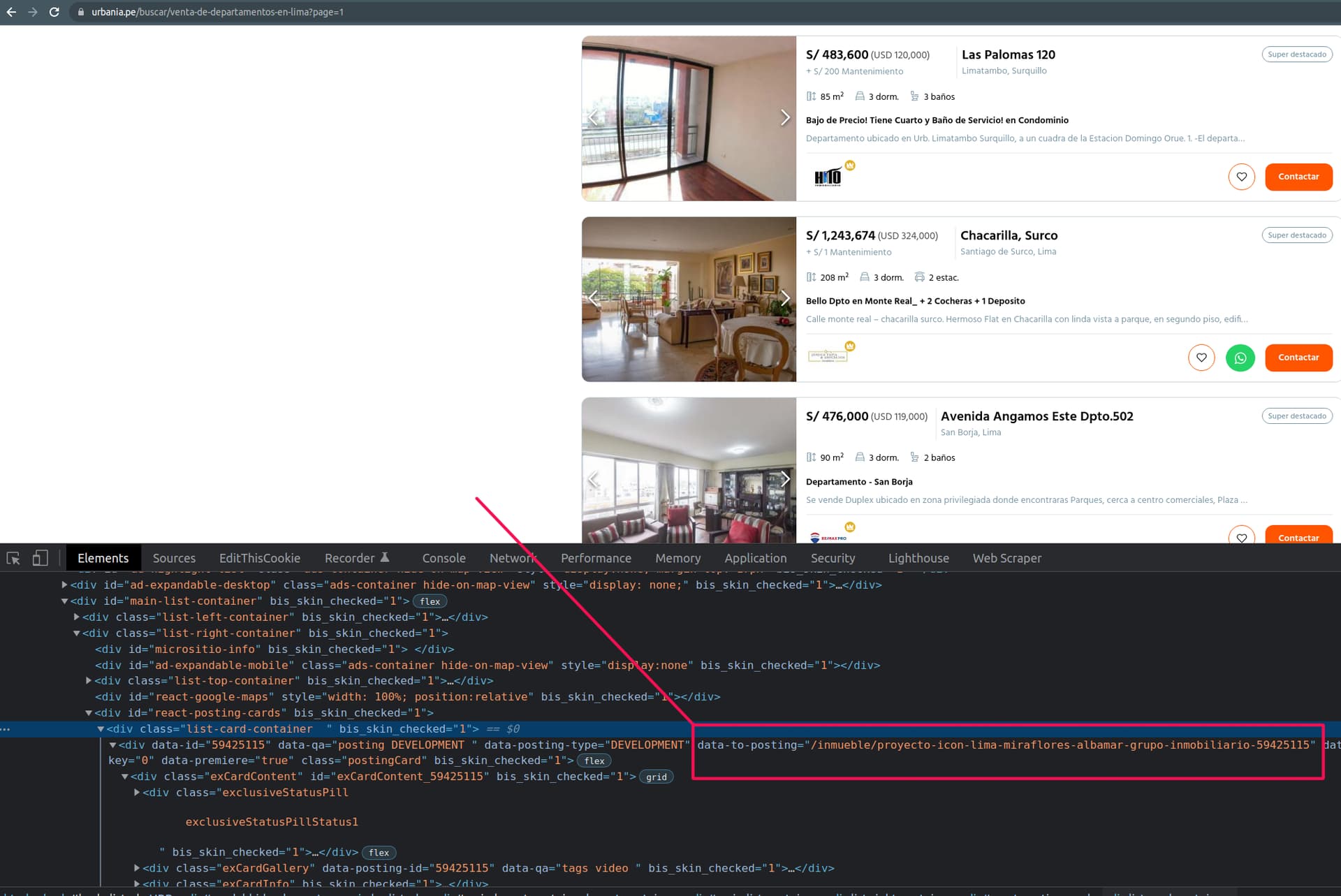 { "_id":"urbania_depto", "startUrl":[ "https://urbania.pe/buscar/venta-de-departamentos-en-lima?page=[1-3]" ], "selectors":[ { "delay":0, "id":"element", "multiple":true, "parentSelectors":[ "_root" ], "selector":"#react-posting-cards > div > div > div:nth-child(n)", "type":"SelectorLink" }, { "delay":0, "id":"metros", "multiple":false, "parentSelectors":[ "element" ], "regex":"", "selector":"div:nth-of-type(3) div.label", "type":"SelectorText" } ] }
