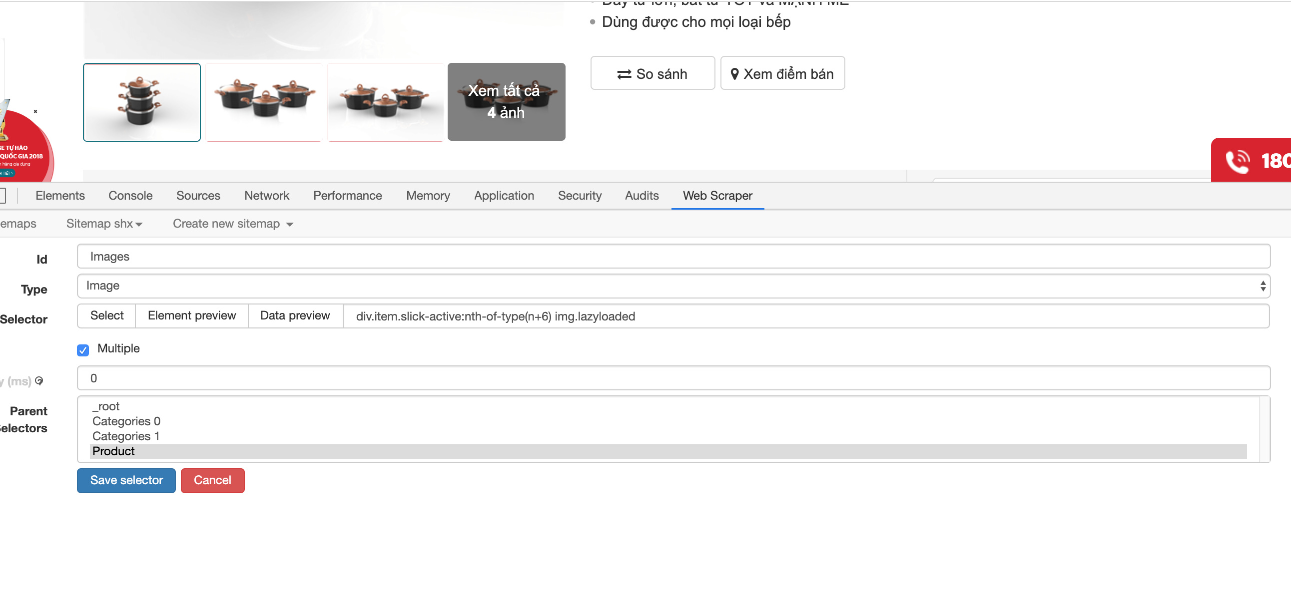 {"_id":"shx","startUrl":["http://sunhouse.com.vn/"],"selectors":[{"id":"Categories 0","type":"SelectorLink","parentSelectors":["_root"],"selector":"div.item.slick-active:nth-of-type(n+8) a.name","multiple":true,"delay":0},{"id":"Categories 1","type":"SelectorLink","parentSelectors":["Categories 0"],"selector":"div.item:nth-of-type(n+4) h2.reset a.name","multiple":true,"delay":0},{"id":"Product","type":"SelectorLink","parentSelectors":["Categories 1"],"selector":"div.cateListProduct.all div.outer a.name","multiple":true,"delay":0},{"id":"Product Title","type":"SelectorText","parentSelectors":["Product"],"selector":"h1.title","multiple":false,"regex":"","delay":0},{"id":"Short Description","type":"SelectorHTML","parentSelectors":["Product"],"selector":"div.dacDiemNoiBat","multiple":false,"regex":"","delay":0},{"id":"Images","type":"SelectorImage","parentSelectors":["Product"],"selector":"div.item.slick-active:nth-of-type(n+6) img.lazyloaded","multiple":true,"delay":0},{"id":"Sku","type":"SelectorText","parentSelectors":["Product"],"selector":"div.code span","multiple":false,"regex":"","delay":0},{"id":"Content","type":"SelectorHTML","parentSelectors":["Product"],"selector":"div.bottom div.col1","multiple":false,"regex":"","delay":0}]}