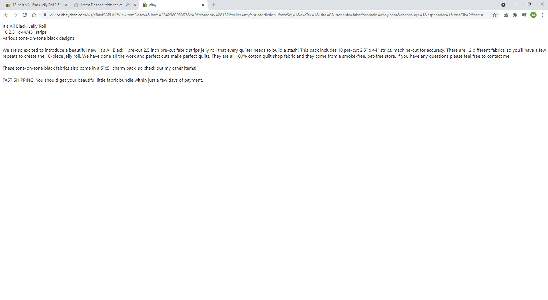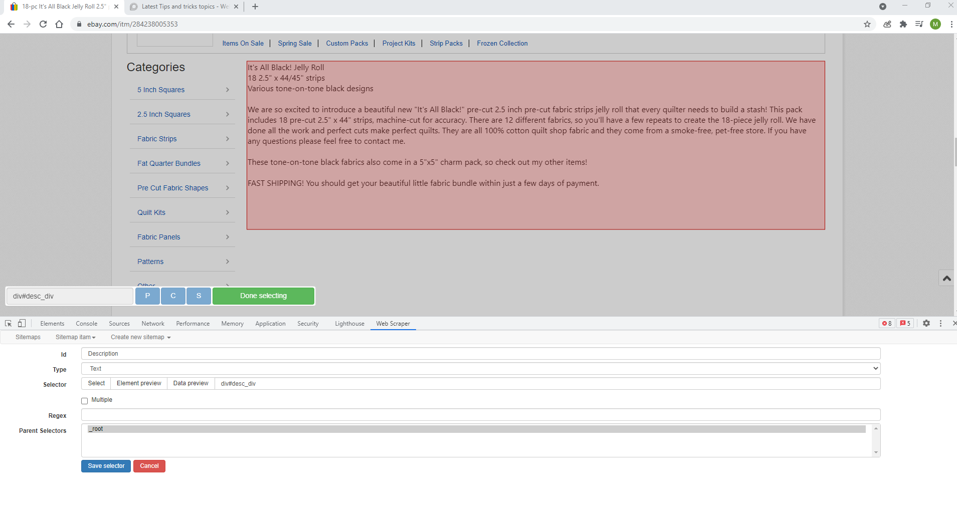 {"_id":"desc","startUrl":["https://vi.vipr.ebaydesc.com/ws/eBayISAPI.dll?ViewItemDescV4&item=284238005353&t=0&category=28162&seller=myfabricaddiction1&excSoj=1&excTrk=1&lsite=0&ittenable=false&domain=ebay.com&descgauge=1&cspheader=1&oneClk=2&secureDesc=1"],"selectors":[{"delay":0,"id":"description","multiple":false,"parentSelectors":["_root"],"regex":"","selector":"div#ds_div","type":"SelectorText"}]}