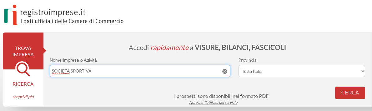 and then enter this text "SOCIETA SPORTIVA" into the field "Nome Impresa o Attività" and then click on the button "CERCA":
