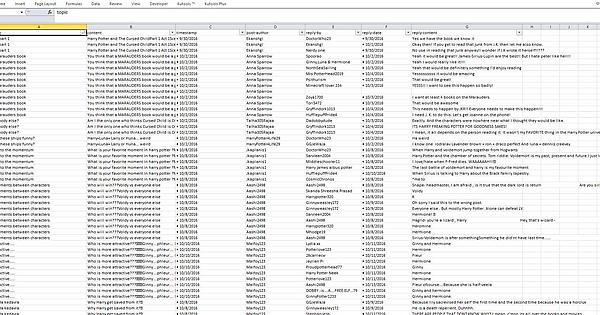 {"_id":"wikia-discussion-final-sitemap","startUrl":["http://harrypotter.wikia.com/d/f?page=[1-1250]"],"selectors":[{"id":"items","type":"SelectorLink","parentSelectors":["_root"],"selector":"a.post-content__link","multiple":true,"delay":0},{"id":"topic","type":"SelectorText","parentSelectors":["items"],"selector":"h1.post-content__title","multiple":false,"regex":"","delay":0},{"id":"content","type":"SelectorText","parentSelectors":["items"],"selector":"div.post-content__body","multiple":false,"regex":"","delay":0},{"id":"timestamp","type":"SelectorText","parentSelectors":["items"],"selector":"div.post-card__body span.timestamp","multiple":false,"regex":"","delay":0},{"id":"post-author","type":"SelectorText","parentSelectors":["items"],"selector":"div.post-card__body a.user-avatar__username","multiple":false,"regex":"","delay":0},{"id":"replies-for-main-post-element","type":"SelectorElement","parentSelectors":["items"],"selector":"div.discussion-reply","multiple":true,"delay":0},{"id":"reply-by","type":"SelectorText","parentSelectors":["replies-for-main-post-element"],"selector":"a.user-avatar__username","multiple":false,"regex":"","delay":0},{"id":"reply-date","type":"SelectorText","parentSelectors":["replies-for-main-post-element"],"selector":"span.timestamp","multiple":false,"regex":"","delay":0},{"id":"reply-content","type":"SelectorText","parentSelectors":["replies-for-main-post-element"],"selector":"div.post-content","multiple":false,"regex":"","delay":0}]}