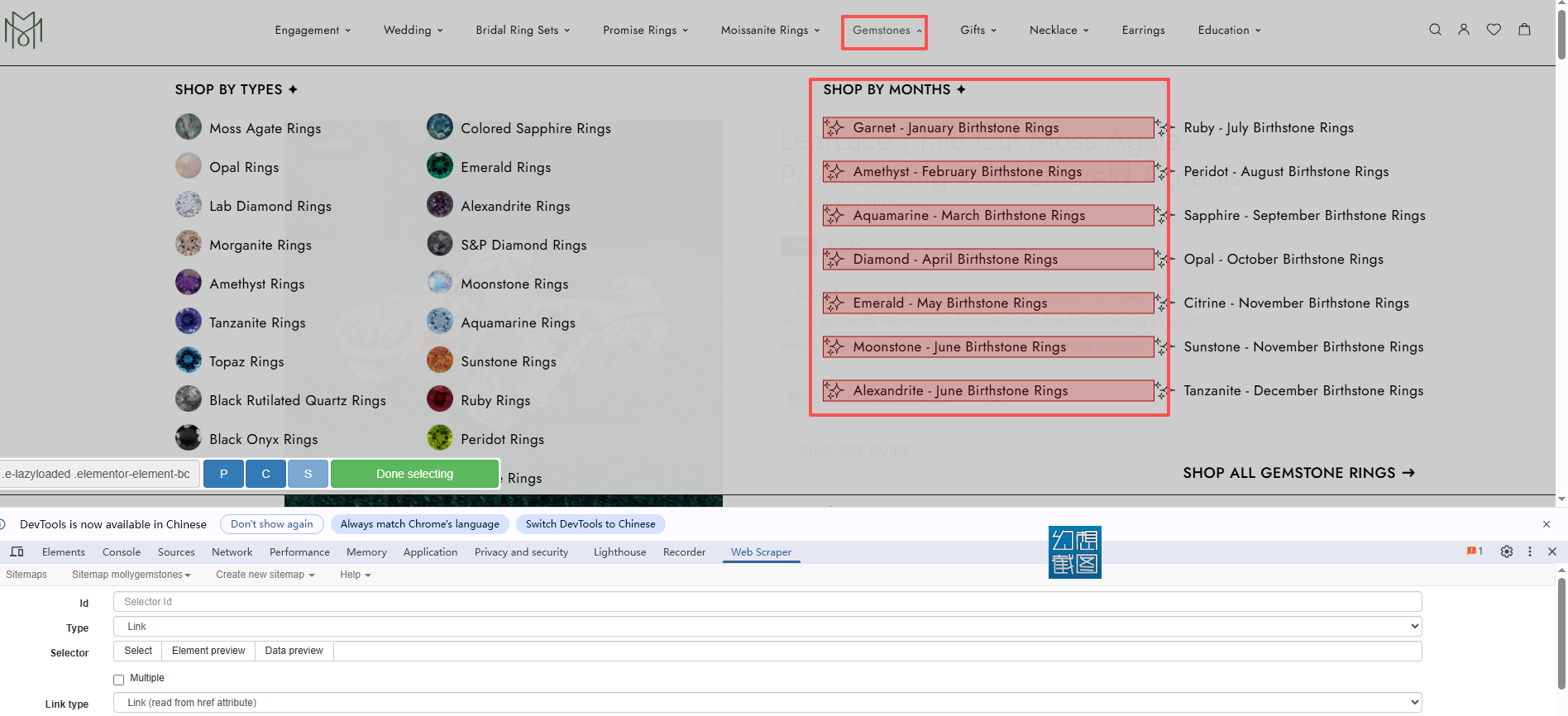 1.I want to scrape products from 14 different gemstone categories. However, when I hover over “Gemstones,” — ruby, peridot, sapphire, opal, citrine, sunstone, and tanzanite — can not be selected,