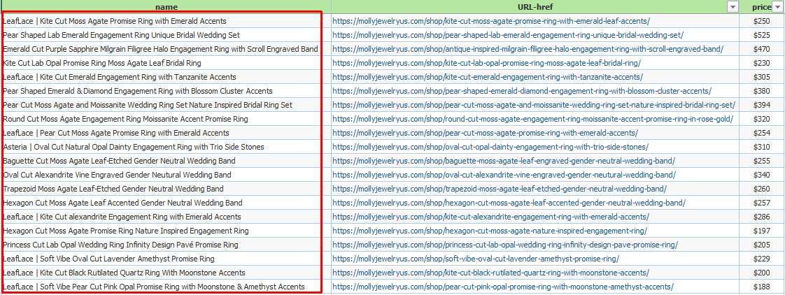 Sitemap: {"_id":"mollygemstones","startUrl":["https://mollyjewelryus.com/"],"selectors":[{"id":"7choose","linkType":"linkFromHref","multiple":true,"parentSelectors":["_root"],"selector":".e-lazyloaded .elementor-element-bcc1373 a","type":"SelectorLink"},{"id":"another7","linkType":"linkFromHref","multiple":true,"parentSelectors":["_root"],"selector":".e-lazyloaded .elementor-element-6aacadd .elementor-icon-list-item a","type":"SelectorLink"},{"id":"differentpage","paginationType":"auto","parentSelectors":["7choose","differentpage"],"selector":"a.next","type":"SelectorPagination"},{"id":"eachproduct link","linkType":"linkFromHref","multiple":true,"parentSelectors":["7choose"],"selector":".c-product-grid__title-wrap a:nth-of-type(1)","type":"SelectorLink"},{"id":"titile","multiple":false,"multipleType":"singleColumn","parentSelectors":["eachproduct link"],"regex":"","selector":"h1","type":"SelectorText"},{"id":"price","multiple":false,"multipleType":"singleColumn","parentSelectors":["eachproduct link"],"regex":"","selector":"p ins bdi","type":"SelectorText"},{"id":"image1","multiple":false,"multipleType":"singleColumn","parentSelectors":["eachproduct link"],"selector":".active img.c-product__slider-img","type":"SelectorImage"},{"id":"image2","multiple":false,"multipleType":"singleColumn","parentSelectors":["eachproduct link"],"selector":".active img.c-product__slider-img","type":"SelectorImage"},{"id":"pagination","paginationType":"auto","parentSelectors":["another7","pagination"],"selector":"a.next","type":"SelectorPagination"},{"id":"eachlink","linkType":"linkFromHref","multiple":true,"parentSelectors":["another7"],"selector":".c-product-grid__title-wrap a:nth-of-type(1)","type":"SelectorLink"},{"id":"title","multiple":false,"multipleType":"singleColumn","parentSelectors":["eachlink"],"regex":"","selector":"h1","type":"SelectorText"},{"id":"prices","multiple":false,"multipleType":"singleColumn","parentSelectors":["eachlink"],"regex":"","selector":"p bdi","type":"SelectorText"},{"id":"image11","multiple":false,"multipleType":"singleColumn","parentSelectors":["eachlink"],"selector":".active img.c-product__slider-img","type":"SelectorImage"},{"id":"image22","multiple":false,"multipleType":"singleColumn","parentSelectors":["eachlink"],"selector":".active img.c-product__slider-img","type":"SelectorImage"}]}
