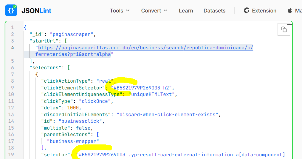 {"_id":"paginasamarillas-com-do-2026-02-08","startUrl":["https://paginasamarillas.com.do/en/business/search/republica-dominicana/c/ferreterias?p=1&sort=alpha"],"selectors":[{"id":"businessselect","linkType":"linkFromHref","multiple":true,"parentSelectors":["_root"],"selector":".yp-result-card-external-information a[data-component]","type":"SelectorLink","version":2},{"clickActionType":"real","clickElementSelector":"li div button.flex","clickElementUniquenessType":"uniqueCSSSelector","clickType":"clickOnce","delay":1000,"discardInitialElements":"discard-when-click-element-exists","id":"clickbutton","multiple":true,"parentSelectors":["businessselect"],"selector":"div.col-start-3","type":"SelectorElementClick"}]}