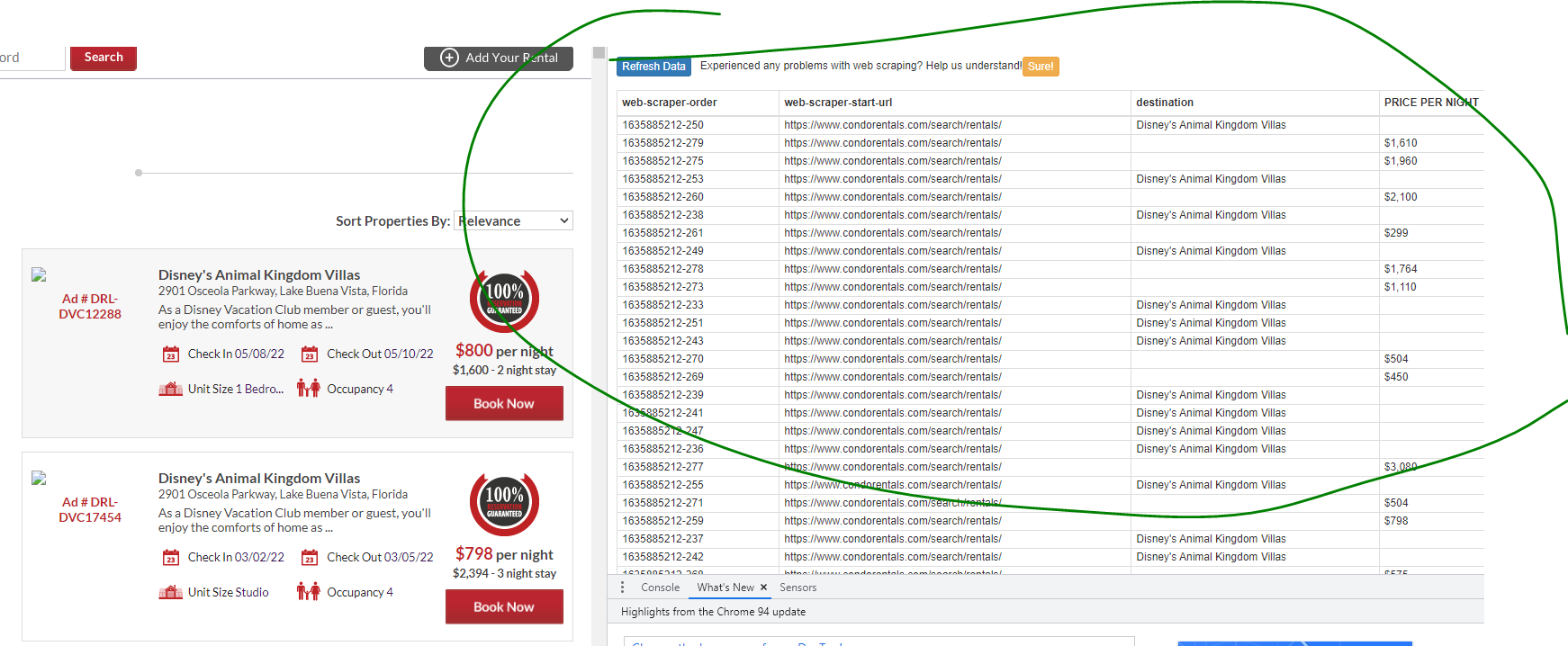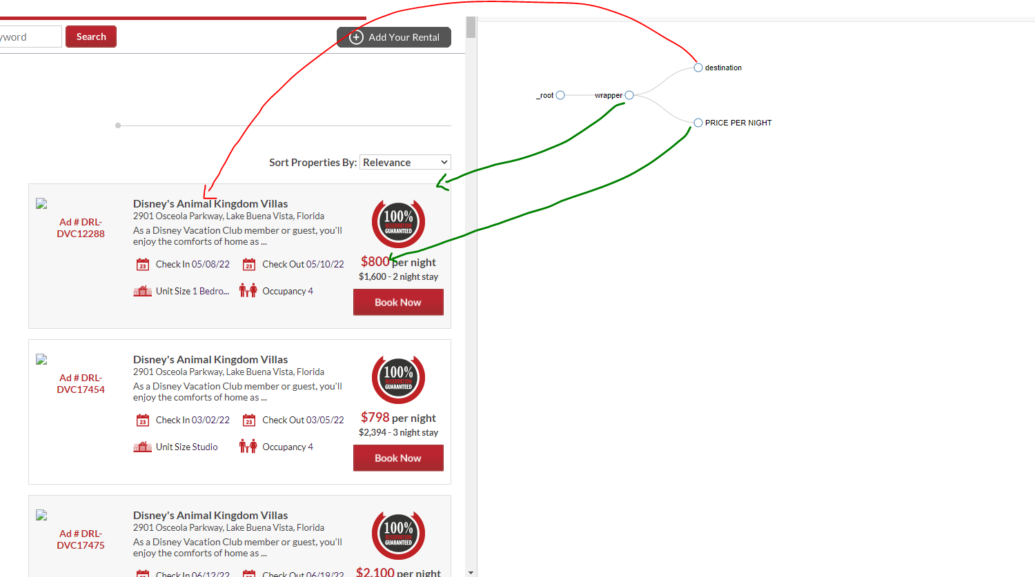 I am getting a misaligned result table after the scrape. The goal is to pull destination and price per night from the site