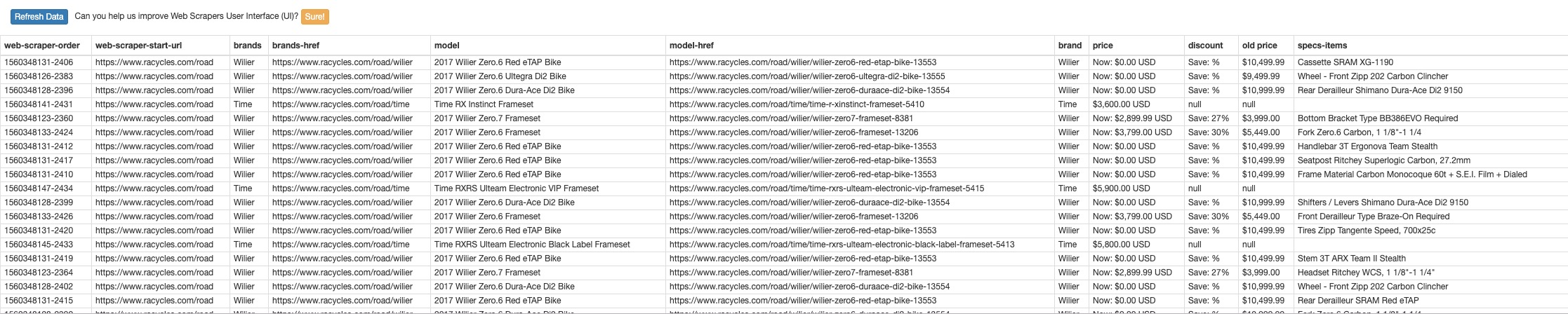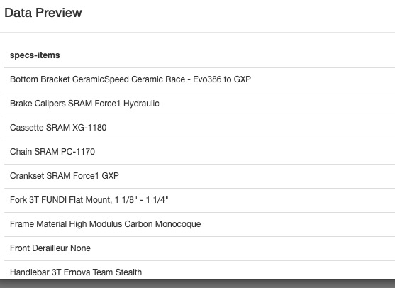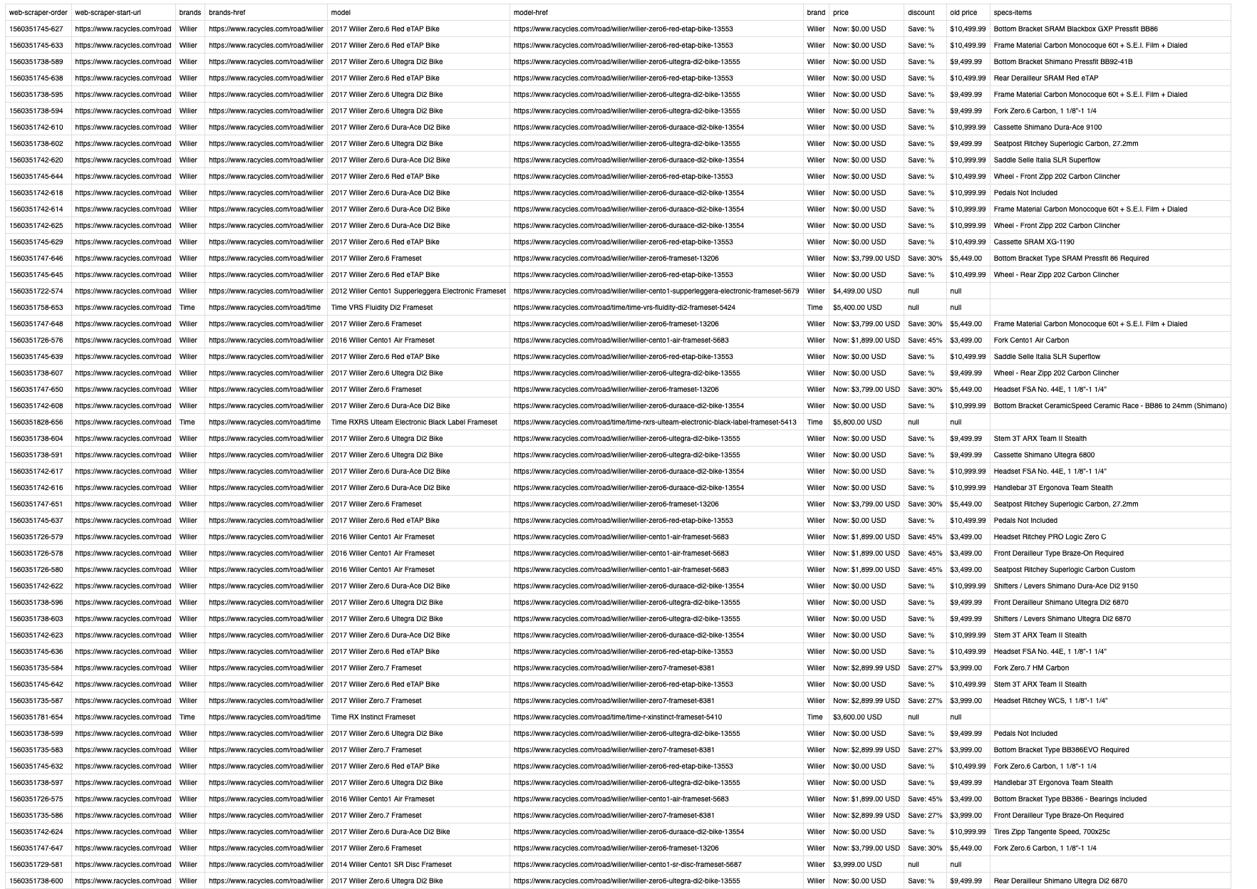 {"_id":"rna-cycles","startUrl":["https://www.racycles.com/road"],"selectors":[{"id":"brands","type":"SelectorLink","parentSelectors":["_root"],"selector":"div.col-sm-12 div.col-sm-6 a","multiple":true,"delay":0},{"id":"model","type":"SelectorLink","parentSelectors":["brands"],"selector":"a.ng-binding","multiple":true,"delay":0},{"id":"brand","type":"SelectorText","parentSelectors":["model"],"selector":"ul.breadcrumb li:nth-of-type(3) a","multiple":false,"regex":"","delay":0},{"id":"price","type":"SelectorText","parentSelectors":["model"],"selector":"ul.prodPagePrices:nth-of-type(1) li.currPrice","multiple":false,"regex":"","delay":0},{"id":"discount","type":"SelectorText","parentSelectors":["model"],"selector":"li.priceDiff","multiple":false,"regex":"","delay":0},{"id":"old price","type":"SelectorText","parentSelectors":["model"],"selector":"li.oldPrice","multiple":false,"regex":"","delay":0},{"id":"Specifications","type":"SelectorElement","parentSelectors":["model"],"selector":"ul.specificationInfo","multiple":false,"delay":0},{"id":"specs-items","type":"SelectorText","parentSelectors":["Specifications"],"selector":"li.ng-binding.ng-scope","multiple":true,"regex":"","delay":0}]}