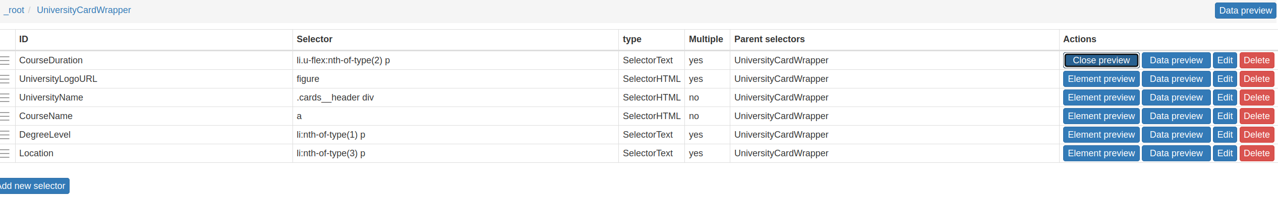{"_id":"studyingermany","startUrl":["https://www.study-in-germany.de/en/plan-your-studies/study-options/programme/higher-education-compass/?hec-p=[1-1093]"],"selectors":[{"id":"CourseDuration","multiple":true,"parentSelectors":["UniversityCardWrapper"],"regex":"","selector":"li.u-flex:nth-of-type(2) p","type":"SelectorText"},{"id":"UniversityLogoURL","multiple":true,"parentSelectors":["UniversityCardWrapper"],"regex":"src=\"(.*?)\" alt=\"Logo","selector":"figure","type":"SelectorHTML"},{"id":"UniversityCardWrapper","multiple":true,"parentSelectors":["_root"],"selector":"article","type":"SelectorElement"},{"id":"UniversityName","multiple":false,"parentSelectors":["UniversityCardWrapper"],"regex":"font-body-small\" data-v-b407dd80=\"\">(.*?)</p>","selector":".cards__header div","type":"SelectorHTML"},{"id":"CourseName","multiple":false,"parentSelectors":["UniversityCardWrapper"],"regex":"data-v-b407dd80=\"\">(.*?)</h3>","selector":"a","type":"SelectorHTML"},{"id":"DegreeLevel","multiple":true,"parentSelectors":["UniversityCardWrapper"],"regex":"","selector":"li:nth-of-type(1) p","type":"SelectorText"},{"id":"Location","multiple":true,"parentSelectors":["UniversityCardWrapper"],"regex":"","selector":"li:nth-of-type(3) p","type":"SelectorText"}]}