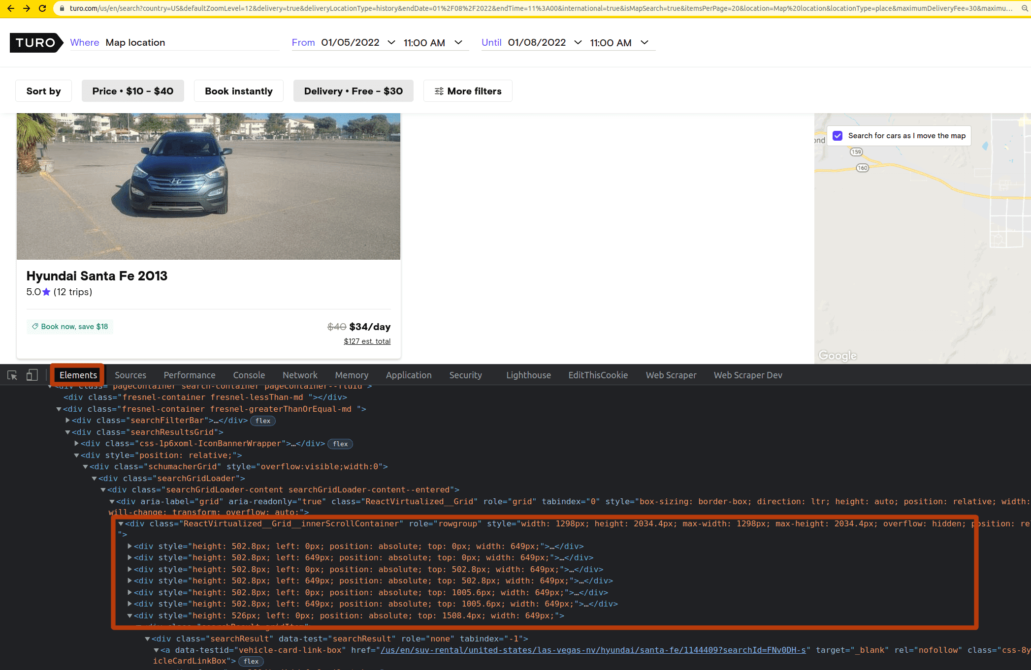 {"_id":"turo_chrome_MAIN","startUrl":["https://turo.com/us/en/search?defaultZoomLevel=11&delivery=true&deliveryLocationType=history&endDate=01%2F08%2F2022&endTime=11%3A00&international=true&isMapSearch=false&itemsPerPage=20&latitude=36.084&location=LAS%20-%20McCarran%20International%20Airport&longitude=-115.15374&maximumDeliveryFee=30&maximumDistanceInMiles=50&maximumPrice=40&minimumPrice=10&placeId=ChIJXZwEH5_FyIARHh7EHiRZE0c&sortType=RELEVANCE&startDate=01%2F05%2F2022&startTime=11%3A00"],"selectors":[{"delay":0,"id":"car-link","multiple":true,"parentSelectors":["_root"],"selector":"a.css-8ydh9n-VehicleCardLinkBox","type":"SelectorLink"},{"delay":3000,"id":"scroll","multiple":false,"parentSelectors":["_root"],"selector":"div.searchResultsGrid","type":"SelectorElementScroll"},{"delay":0,"id":"model","multiple":false,"parentSelectors":["car-link"],"regex":"","selector":"h1","type":"SelectorText"},{"delay":0,"id":"rating","multiple":false,"parentSelectors":["car-link"],"regex":"","selector":"p.css-5a4mo9-StyledText","type":"SelectorText"},{"delay":0,"id":"price","multiple":false,"parentSelectors":["car-link"],"regex":"","selector":".u-rlMarginBottom16 .css-s587q0-StyledText span","type":"SelectorText"},{"delay":0,"id":"discounts","multiple":false,"parentSelectors":["car-link"],"regex":"","selector":"div.css-1lbm828-Well","type":"SelectorText"},{"delay":0,"id":"popularity","multiple":false,"parentSelectors":["car-link"],"regex":"\\d","selector":"div > span.css-mrzgsa-StyledText","type":"SelectorText"},{"delay":0,"id":"delivery","multiple":false,"parentSelectors":["car-link"],"regex":"","selector":"div.vehicleMapDetails-container","type":"SelectorText"},{"delay":2000,"id":"car-scroll","multiple":false,"parentSelectors":["car-link"],"selector":"[aria-busy] > div.fresnel-greaterThanOrEqual-md","type":"SelectorElementScroll"}]}