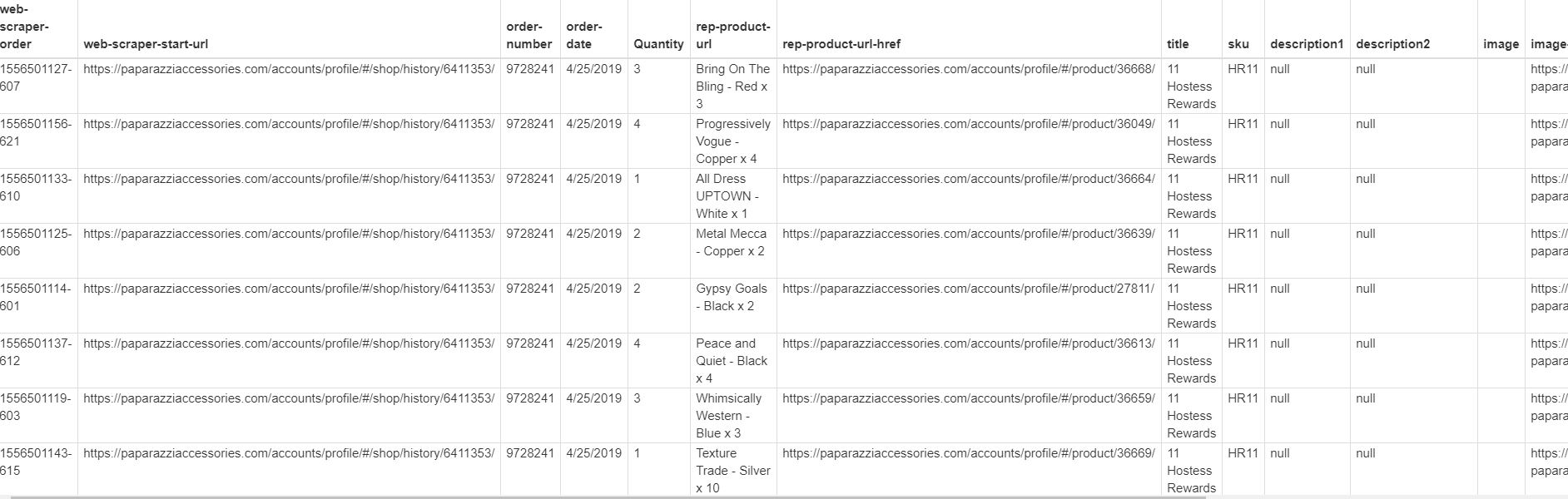 {"_id":"full-order-product-scrape","startUrl":["https://paparazziaccessories.com/accounts/profile/#/shop/history/6411353/"],"selectors":[{"id":"order-number","type":"SelectorText","parentSelectors":["_root"],"selector":"h2","multiple":false,"regex":"(?<=\#)(.?)(?=\ )","delay":0},{"id":"order-date","type":"SelectorText","parentSelectors":["_root"],"selector":"h2","multiple":false,"regex":"(?<=\ ).$","delay":0},{"id":"Quantity","type":"SelectorText","parentSelectors":["element"],"selector":"a","multiple":false,"regex":"\d","delay":0},{"id":"rep-product-url","type":"SelectorLink","parentSelectors":["_root","element"],"selector":"a","multiple":false,"delay":0},{"id":"title","type":"SelectorText","parentSelectors":["rep-product-url"],"selector":"a.name","multiple":false,"regex":"","delay":0},{"id":"sku","type":"SelectorText","parentSelectors":["rep-product-url"],"selector":"div.sku","multiple":false,"regex":"(?<=\#).*$","delay":0},{"id":"description1","type":"SelectorText","parentSelectors":["rep-product-url"],"selector":".description p:nth-of-type(1)","multiple":false,"regex":"","delay":0},{"id":"description2","type":"SelectorHTML","parentSelectors":["rep-product-url"],"selector":"p:nth-of-type(2)","multiple":false,"regex":"","delay":0},{"id":"image-url","type":"SelectorElement","parentSelectors":["rep-product-url"],"selector":"div.product-images-list","multiple":false,"delay":0},{"id":"image","type":"SelectorLink","parentSelectors":["image-url"],"selector":"a","multiple":true,"delay":0},{"id":"element","type":"SelectorElement","parentSelectors":["_root"],"selector":"li.list-group-item","multiple":true,"delay":0}]}
