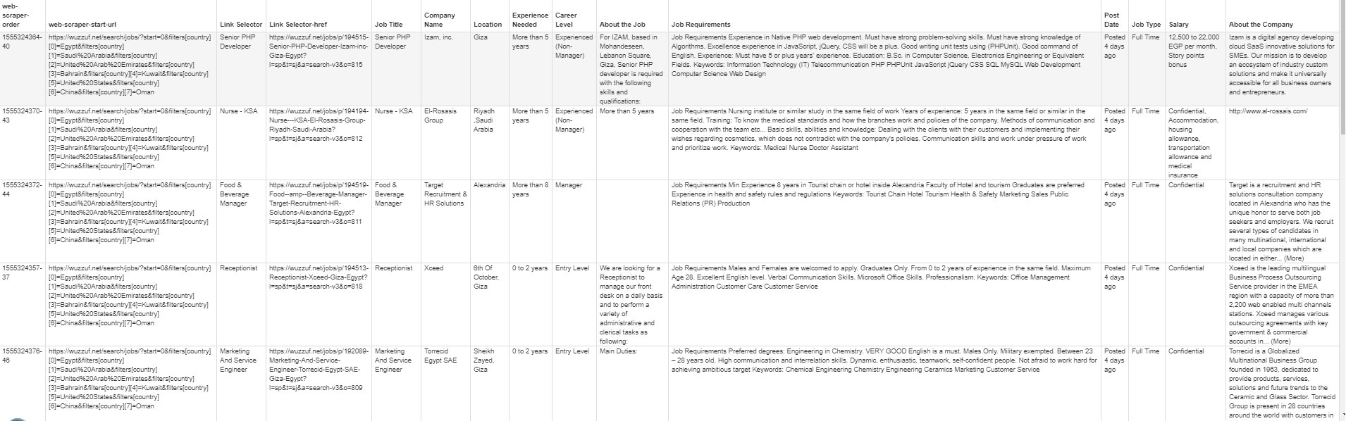 {"_id":"wuzzuf_new_jobs","startUrl":["https://wuzzuf.net/search/jobs/?start=0&filters[country][0]=Egypt&filters[country][1]=Saudi%20Arabia&filters[country][2]=United%20Arab%20Emirates&filters[country][3]=Bahrain&filters[country][4]=Kuwait&filters[country][5]=United%20States&filters[country][6]=China&filters[country][7]=Oman"],"selectors":[{"id":"Pegination","type":"SelectorLink","parentSelectors":["_root","Pegination"],"selector":"ul.pagination.desktop-pagination li.pag-next a","multiple":false,"delay":0},{"id":"Link Selector","type":"SelectorLink","parentSelectors":["_root","Pegination"],"selector":"h2.job-title a","multiple":true,"delay":0},{"id":"Job Title","type":"SelectorText","parentSelectors":["Link Selector"],"selector":"h1.job-title","multiple":false,"regex":"","delay":0},{"id":"Company Name","type":"SelectorText","parentSelectors":["Link Selector"],"selector":"a.job-company-name","multiple":false,"regex":"","delay":0},{"id":"Location","type":"SelectorText","parentSelectors":["Link Selector"],"selector":"span.job-company-location span","multiple":false,"regex":"","delay":0},{"id":"Experience Needed","type":"SelectorText","parentSelectors":["Link Selector"],"selector":"tr:nth-of-type(1) td:nth-of-type(1) dd","multiple":false,"regex":"","delay":0},{"id":"Career Level","type":"SelectorText","parentSelectors":["Link Selector"],"selector":"tr:nth-of-type(1) td:nth-of-type(2) dd","multiple":false,"regex":"","delay":0},{"id":"About the Job","type":"SelectorText","parentSelectors":["Link Selector"],"selector":"div.about-job","multiple":false,"regex":"","delay":0},{"id":"Job Requirements","type":"SelectorText","parentSelectors":["Link Selector"],"selector":"div.job-requirements","multiple":false,"regex":"","delay":0},{"id":"Post Date","type":"SelectorText","parentSelectors":["Link Selector"],"selector":"p.job-post-date","multiple":false,"regex":"","delay":0},{"id":"Job Type","type":"SelectorText","parentSelectors":["Link Selector"],"selector":"span.job-type","multiple":false,"regex":"","delay":0},{"id":"Salary","type":"SelectorText","parentSelectors":["Link Selector"],"selector":"dl.salary-info dd","multiple":false,"regex":"","delay":0},{"id":"About the Company","type":"SelectorText","parentSelectors":["Link Selector"],"selector":"div.col-sm-8 p.company-brief","multiple":false,"regex":"","delay":0}]}
