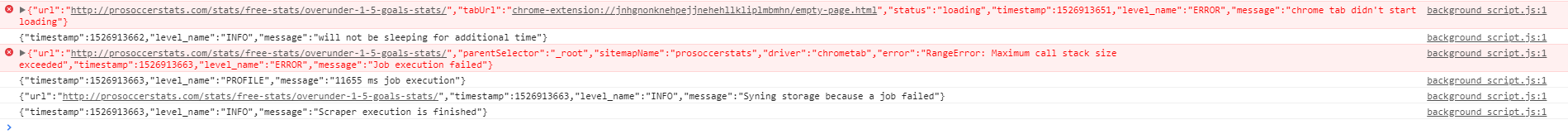 {"_id":"prosoccerstats","startUrl":["http://prosoccerstats.com/stats/free-stats/overunder-1-5-goals-stats/"],"selectors":[{"id":"tabela","type":"SelectorTable","selector":"table#table_1","parentSelectors":["_root","pagination"],"multiple":true,"columns":[{"header":"Country","name":"Country","extract":true},{"header":"Competition","name":"Competition","extract":true},{"header":"Date","name":"Date","extract":true},{"header":"KO","name":"KO","extract":true},{"header":"Home","name":"Home","extract":true},{"header":"Away","name":"Away","extract":true},{"header":"HL 20","name":"HL 20","extract":true},{"header":"HL 10 H","name":"HL 10 H","extract":true},{"header":"HL 6","name":"HL 6","extract":true},{"header":"AL 20","name":"AL 20","extract":true},{"header":"AL 10 A","name":"AL 10 A","extract":true},{"header":"AL 6","name":"AL 6","extract":true},{"header":"AVG","name":"AVG","extract":true},{"header":"H2H No","name":"H2H No","extract":true},{"header":"H2H %","name":"H2H %","extract":true}],"delay":0,"tableDataRowSelector":"tbody tr","tableHeaderRowSelector":"thead tr"},{"id":"pagination","type":"SelectorElementClick","selector":"a#table_1_next","parentSelectors":["_root","pagination"],"multiple":true,"delay":0,"clickElementSelector":"a#table_1_next","clickType":"clickOnce","discardInitialElements":false,"clickElementUniquenessType":"uniqueText"}]}