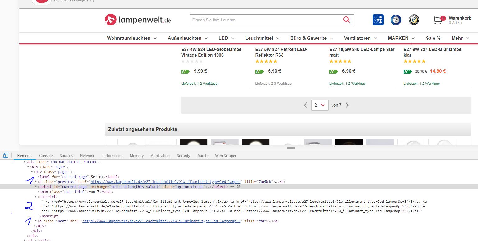 I only can Scrape the previous and the next (Nr. 1) site. As "test" there are all the paginations available (Nr. 2),