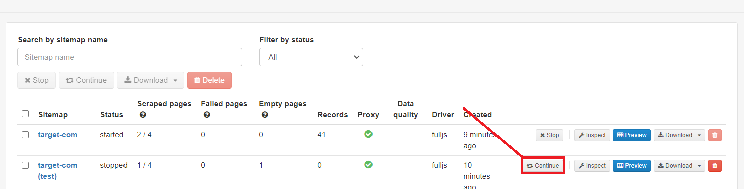 If that happens in Web Scraper Cloud - the page would be marked as ''Empty'' or "Failed"(for example due to page containing a CAPTCHA or being unreachable) and you would have a possibility to re-try scraping such page by pressing the "Continue" button.