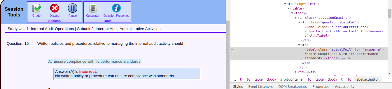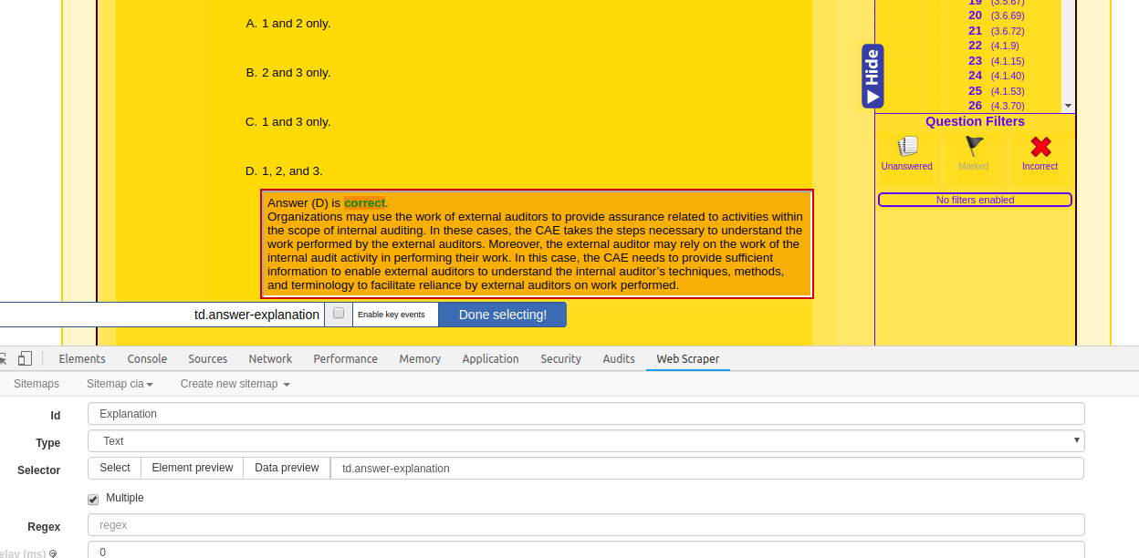 {"_id":"cia","startUrl":["https://www.gleim.com/testprep/cia/2019/part2?action=study"],"selectors":[{"id":"Solution","type":"SelectorElementClick","parentSelectors":["_root"],"selector":"div#mainContent","multiple":false,"delay":"0","clickElementSelector":"label.actualFoil","clickType":"clickOnce","discardInitialElements":true,"clickElementUniquenessType":"uniqueText"},{"id":"Explanation","type":"SelectorText","parentSelectors":["Solution"],"selector":"td.answer-explanation","multiple":true,"regex":"","delay":0},{"id":"next","type":"SelectorElementClick","parentSelectors":["_root"],"selector":"div#mainContent","multiple":true,"delay":"0","clickElementSelector":"a.goTo span.questionSource","clickType":"clickOnce","discardInitialElements":true,"clickElementUniquenessType":"uniqueText"},{"id":"Title","type":"SelectorText","parentSelectors":["next"],"selector":"div.question-source","multiple":false,"regex":"","delay":0},{"id":"Number","type":"SelectorText","parentSelectors":["next"],"selector":"span.mcqQuestionNum","multiple":false,"regex":"","delay":0},{"id":"Question","type":"SelectorText","parentSelectors":["next"],"selector":"td#highlightable","multiple":false,"regex":"","delay":0},{"id":"Answer_A","type":"SelectorText","parentSelectors":["next"],"selector":"tr.questionSpacing:contains('A.') td:nth-of-type(2) label.actualFoil","multiple":false,"regex":"","delay":0},{"id":"Answer_B","type":"SelectorText","parentSelectors":["next"],"selector":"tr.questionSpacing:contains('B.') td:nth-of-type(2) label.actualFoil","multiple":false,"regex":"","delay":0},{"id":"Answer_C","type":"SelectorText","parentSelectors":["next"],"selector":"tr.questionSpacing:contains('C.') td:nth-of-type(2) label.actualFoil","multiple":false,"regex":"","delay":0},{"id":"Answer_D","type":"SelectorText","parentSelectors":["next"],"selector":"tr.questionSpacing:contains('D.') td:nth-of-type(2) label.actualFoil","multiple":false,"regex":"","delay":0},{"id":"Fact_Pattern","type":"SelectorText","parentSelectors":["next"],"selector":"td#fact-pattern","multiple":false,"regex":"","delay":0}]}