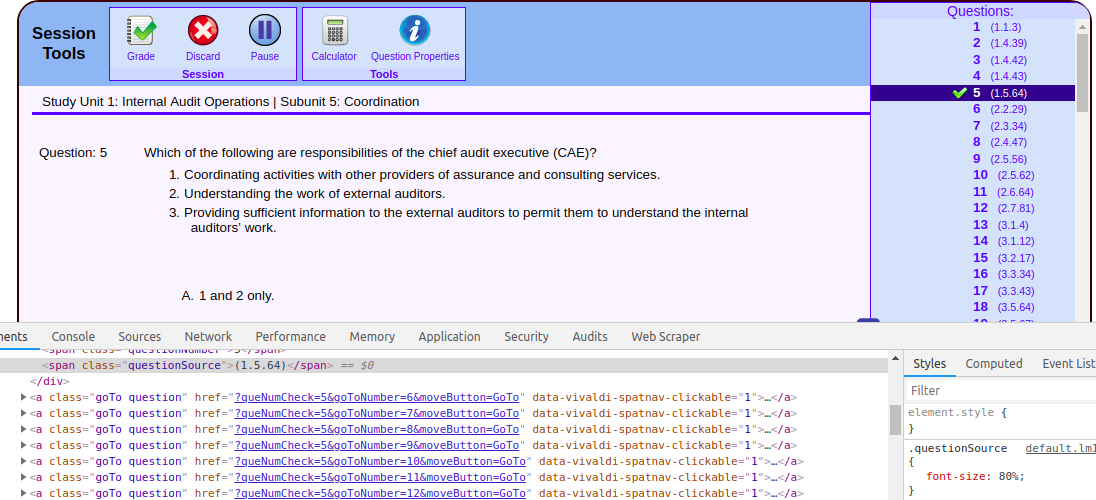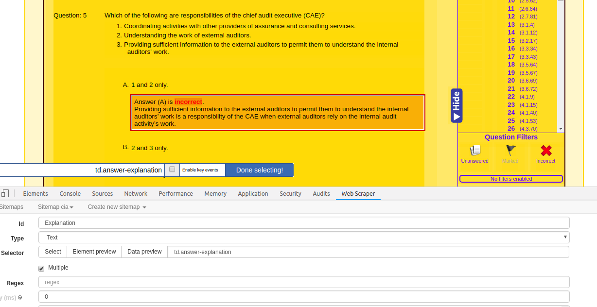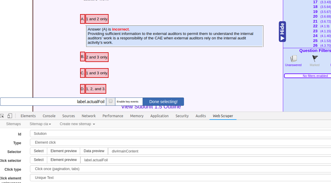 I'm having two ID selectors, frist is 'Solution' which select each button answer A, B, C, D then scrape each answer text. Second is 'Next' which crawl all tab question on the table in the right and scrape text data like title, questions, answers....