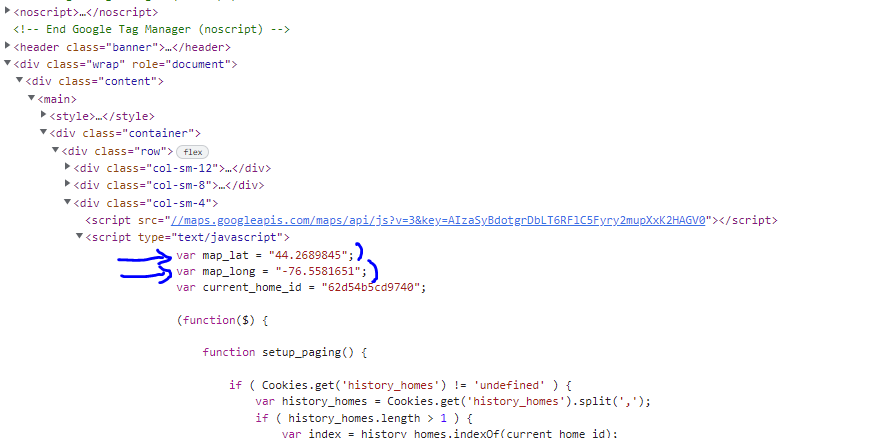 I'm trying to scrape the latitude and longitude from a google API on this page