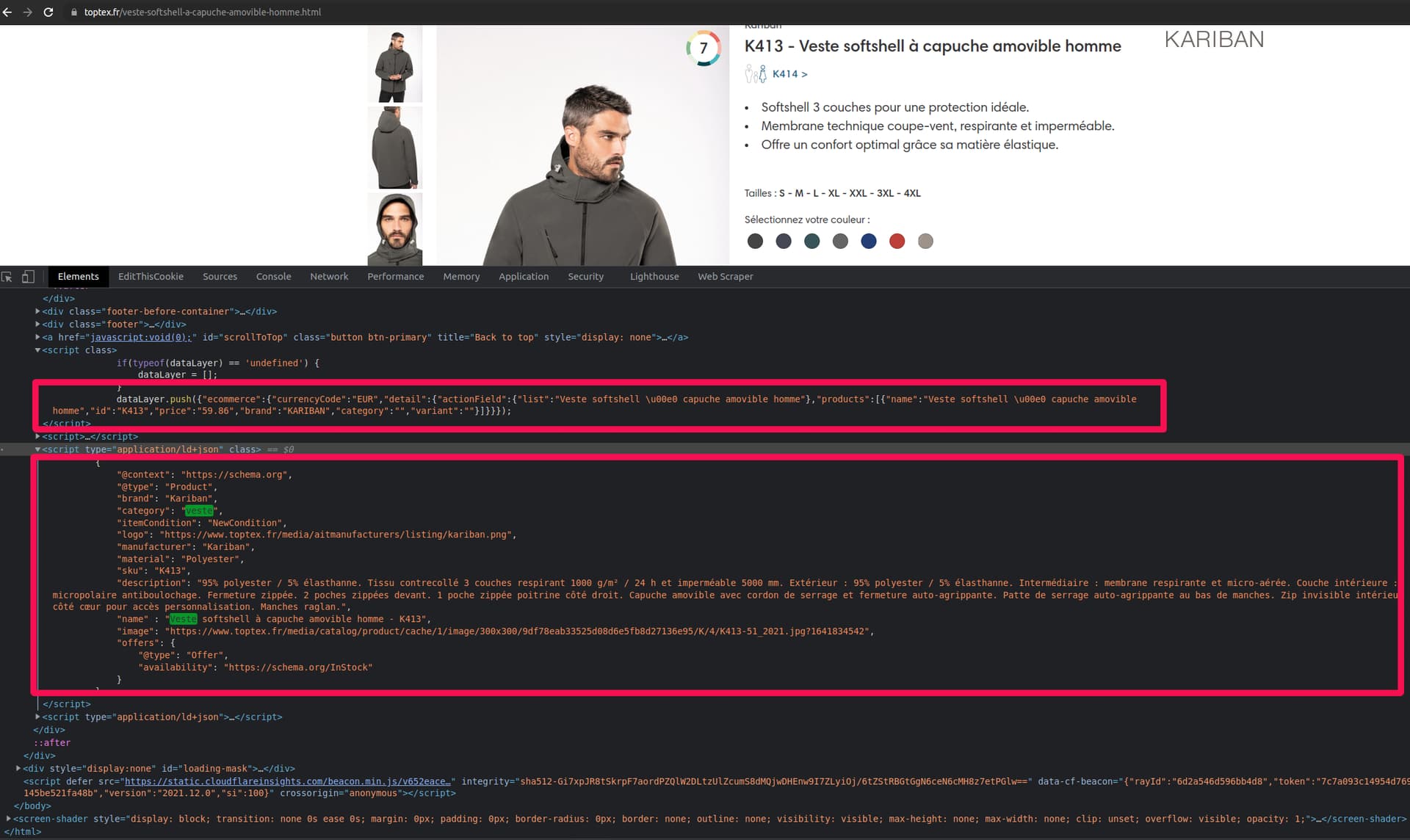 {"_id":"tooooptex","startUrl":["https://www.toptex.fr/veste-softshell-3-couches-a-capuche-avec-manches-amovibles-unisexe.html"],"selectors":[{"delay":0,"id":"hidden-childcategory","multiple":false,"parentSelectors":["_root"],"regex":"","selector":"li.level1, a.level1 has-children > span","type":"SelectorHTML"}]}`Preformatted text`