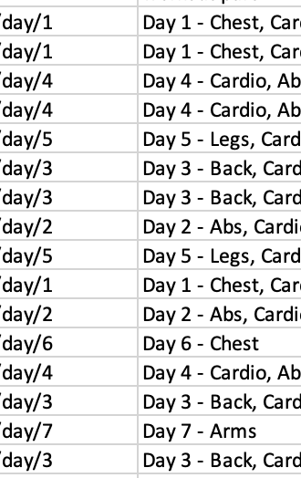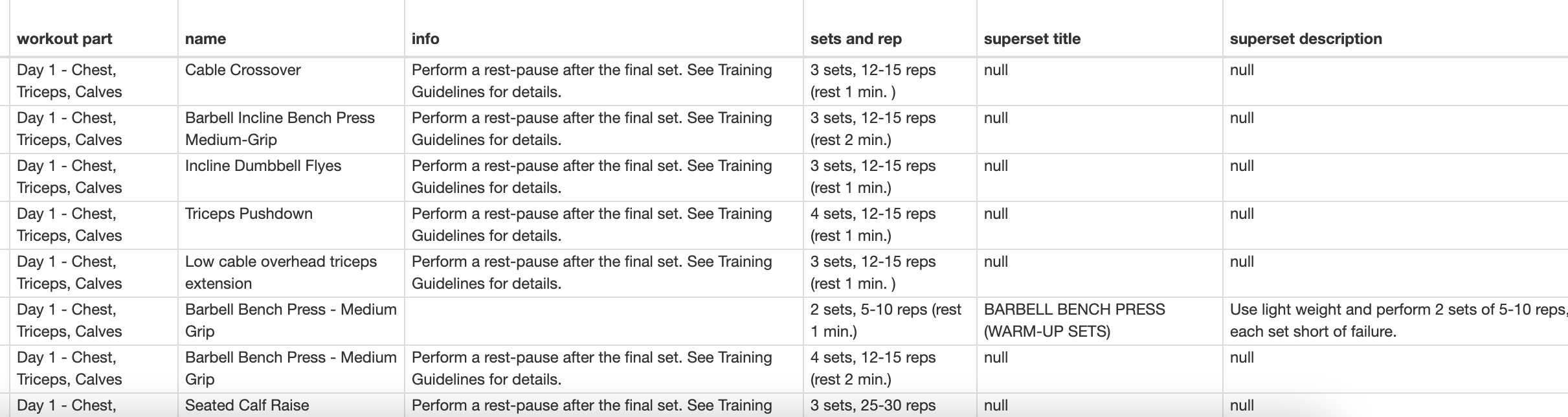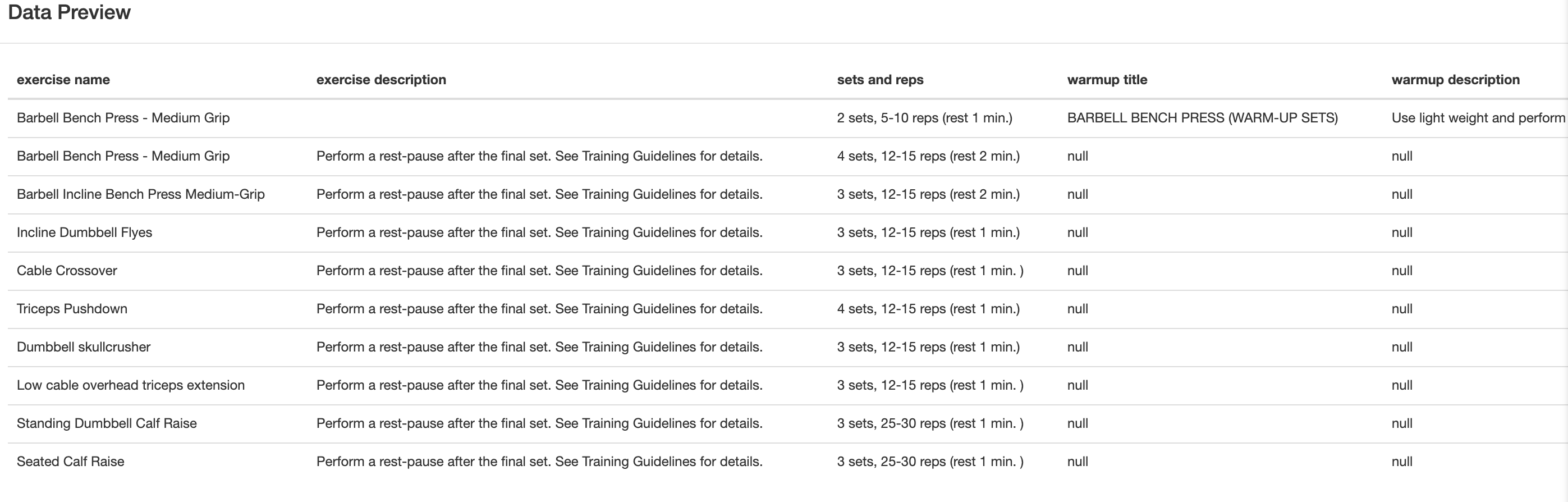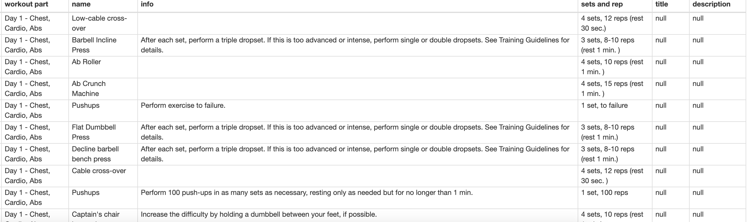 {"_id":"chiseled-weight-loss","startUrl":["https://www.bodybuilding.com/workout-plans/rsp-chiseled-sculpt-your-best-body-in-8-weeks/day/[1-7]"],"selectors":[{"id":"workout part","type":"SelectorText","parentSelectors":["_root"],"selector":"h1","multiple":false,"regex":"","delay":0},{"id":"exercise part","type":"SelectorElement","parentSelectors":["_root"],"selector":"div.cms-article-list__content--container","multiple":true,"delay":0},{"id":"name","type":"SelectorText","parentSelectors":["exercise part"],"selector":"a.cms-article-workout__exercise--title","multiple":false,"regex":"","delay":0},{"id":"info","type":"SelectorText","parentSelectors":["exercise part"],"selector":"div.cms-article-workout__exercise--description","multiple":false,"regex":"","delay":0},{"id":"sets and rep","type":"SelectorText","parentSelectors":["exercise part"],"selector":".cms-article-workout__sets--definition span","multiple":false,"regex":"","delay":0},{"id":"superset title","type":"SelectorText","parentSelectors":["exercise part"],"selector":"div.cms-article-list__content--group-title","multiple":false,"regex":"","delay":0},{"id":"superset description","type":"SelectorText","parentSelectors":["exercise part"],"selector":"div.cms-article-list__content--group-description","multiple":false,"regex":"","delay":0}]}