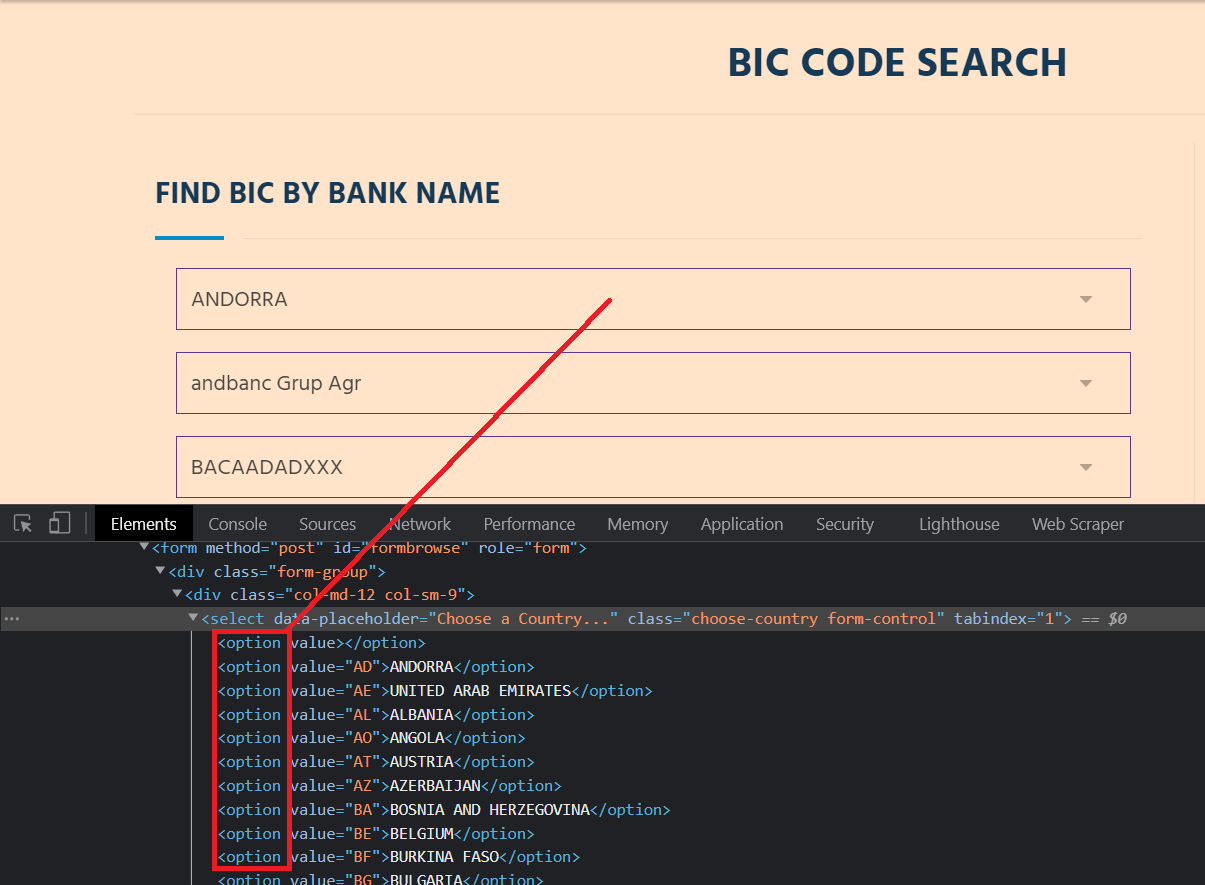 I am trying to gather the BIC + address + zip. The goal is for all countries and for all available selections.