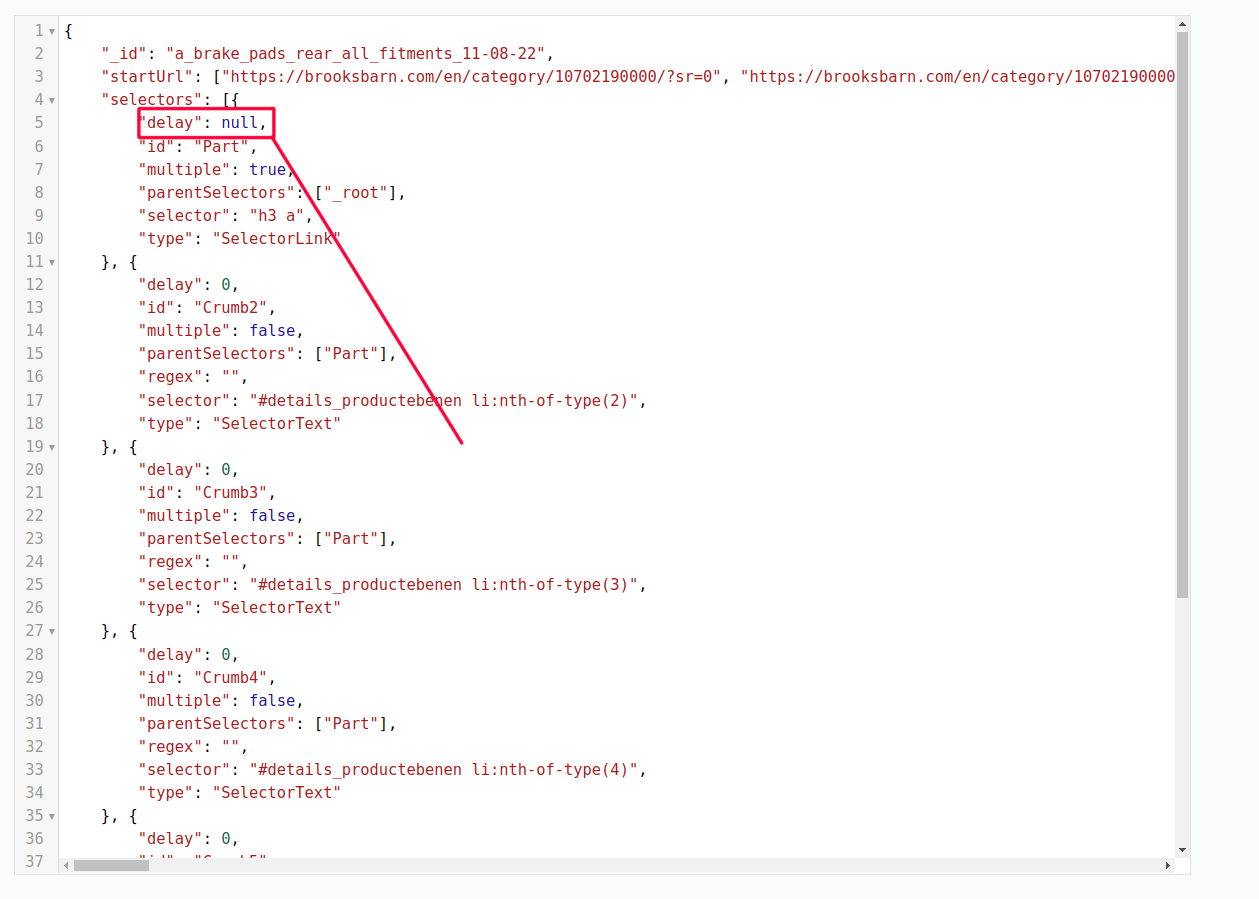 {"_id":"a_brake_pads_rear_all_fitments_11-08-22","startUrl":["Brake pads in Brake rear - Brooks Barn Motorcycles | Motomike a","multiple":true,"delay":null},{"id":"SKU","parentSelectors":["Part"],"type":"SelectorText","selector":"div.mm_drow:nth-of-type(1) div.mm_right","multiple":false,"delay":0,"regex":""},{"id":"Title","parentSelectors":["Part"],"type":"SelectorText","selector":"div:nth-of-type(2) div.mm_right","multiple":false,"delay":0,"regex":""},{"id":"MPN","parentSelectors":["Part"],"type":"SelectorText","selector":"div.mm_drow:nth-of-type(3) div.mm_right","multiple":false,"delay":0,"regex":""},{"id":"Price Unit","parentSelectors":["Part"],"type":"SelectorText","selector":"div:nth-of-type(4) div.mm_right","multiple":false,"delay":0,"regex":""},{"id":"Minimum Order Quantity","parentSelectors":["Part"],"type":"SelectorText","selector":"div.mm_drow:nth-of-type(5) div.mm_right","multiple":false,"delay":0,"regex":""},{"id":"Retail Price Inc","parentSelectors":["Part"],"type":"SelectorText","selector":"div:nth-of-type(6) div.mm_right","multiple":false,"delay":0,"regex":""},{"id":"Retail Price Ex","parentSelectors":["Part"],"type":"SelectorText","selector":"div:nth-of-type(7) div.mm_right","multiple":false,"delay":0,"regex":""},{"id":"Discount","parentSelectors":["Part"],"type":"SelectorText","selector":"div:nth-of-type(8) div.mm_right","multiple":false,"delay":0,"regex":""},{"id":"Seller Cost","parentSelectors":["Part"],"type":"SelectorText","selector":"div:nth-of-type(9) div.mm_right","multiple":false,"delay":0,"regex":""},{"id":"aDesc","parentSelectors":["Part"],"type":"SelectorHTML","selector":"div.goog_trans_cont","multiple":false,"regex":"","delay":0},{"id":"Image1","parentSelectors":["Part"],"type":"SelectorLink","selector":"a.detail_img","multiple":false,"delay":0},{"id":"Image2","parentSelectors":["Part"],"type":"SelectorLink","selector":"a#\32 -mini","multiple":false,"delay":0},{"id":"Image3","parentSelectors":["Part"],"type":"SelectorLink","selector":"a#\33 -mini","multiple":false,"delay":0},{"id":"Image4","parentSelectors":["Part"],"type":"SelectorLink","selector":"a#\34 -mini","multiple":false,"delay":0},{"id":"Image5","parentSelectors":["Part"],"type":"SelectorLink","selector":"a#\35 -mini","multiple":false,"delay":0},{"id":"MPN2","parentSelectors":["Part"],"type":"SelectorText","selector":"div.mm_drow:nth-of-type(3) div.mm_right","multiple":false,"delay":0,"regex":""},{"id":"Breadcrumbs","parentSelectors":["Part"],"type":"SelectorHTML","selector":"ul#details_productebenen","multiple":false,"regex":"","delay":0},{"id":"Crumb1","parentSelectors":["Part"],"type":"SelectorHTML","selector":"#details_productebenen li:nth-of-type(1)","multiple":false,"regex":"","delay":0},{"id":"Crumb2","parentSelectors":["Part"],"type":"SelectorText","selector":"#details_productebenen li:nth-of-type(2)","multiple":false,"delay":0,"regex":""},{"id":"Crumb3","parentSelectors":["Part"],"type":"SelectorText","selector":"#details_productebenen li:nth-of-type(3)","multiple":false,"delay":0,"regex":""},{"id":"Crumb4","parentSelectors":["Part"],"type":"SelectorText","selector":"#details_productebenen li:nth-of-type(4)","multiple":false,"delay":0,"regex":""},{"id":"Crumb5","parentSelectors":["Part"],"type":"SelectorText","selector":"#details_productebenen li:nth-of-type(5)","multiple":false,"delay":0,"regex":""},{"id":"Crumb6","parentSelectors":["Part"],"type":"SelectorText","selector":"#details_productebenen li:nth-of-type(6)","multiple":false,"delay":0,"regex":""}]}
