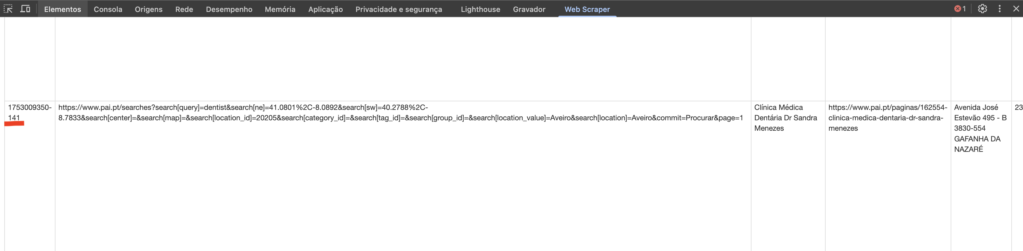 And here’s the sitemap I’m using: {"_id":"PaiPTscraper","startUrl":["https://www.pai.pt/searches?search%5Bquery%5D=dentist&search%5Bne%5D=42.1541%2C-6.4969&search%5Bsw%5D=32.2099%2C-29.8597&search%5Bcenter%5D=&search%5Bmap%5D=&search%5Blocation_id%5D=1&search%5Bcategory_id%5D=&search%5Btag_id%5D=&search%5Bgroup_id%5D=&search%5Blocation_value%5D=Portugal&search%5Blocation%5D=Portugal&search%5Bopen%5D=0&search%5Bcategories%5D%5B%5D=425&search%5Border%5D=relevance"],"selectors":[{"id":"Paganation","parentSelectors":["_root","Paganation"],"paginationType":"auto","type":"SelectorPagination","selector":".next a"},{"id":"product link","parentSelectors":["Paganation"],"type":"SelectorLink","selector":"a.card-link","multiple":true,"linkType":"linkFromHref"},{"id":"address","parentSelectors":["product link"],"type":"SelectorText","selector":"li:nth-of-type(1) div","multiple":false,"regex":""},{"id":"phone","parentSelectors":["product link"],"type":"SelectorText","selector":"div.desktop","multiple":false,"regex":""},{"id":"website","parentSelectors":["product link"],"type":"SelectorLink","selector":"a[data-trackable-event='visit-webpage']","multiple":false,"linkType":"linkFromHref"},{"id":"email 1","parentSelectors":["product link"],"type":"SelectorHTML","selector":"li.listing-item:nth-of-type(4)","multiple":false,"regex":""},{"id":"email 2","parentSelectors":["product link"],"type":"SelectorText","selector":"li.listing-item:nth-of-type(5)","multiple":false,"regex":""},{"id":"Full details","parentSelectors":["product link"],"type":"SelectorHTML","selector":"ul.listing-details","multiple":false,"regex":""},{"id":"Time","parentSelectors":["product link"],"type":"SelectorText","selector":"div.not-mobile-xl","multiple":false,"regex":""}]}