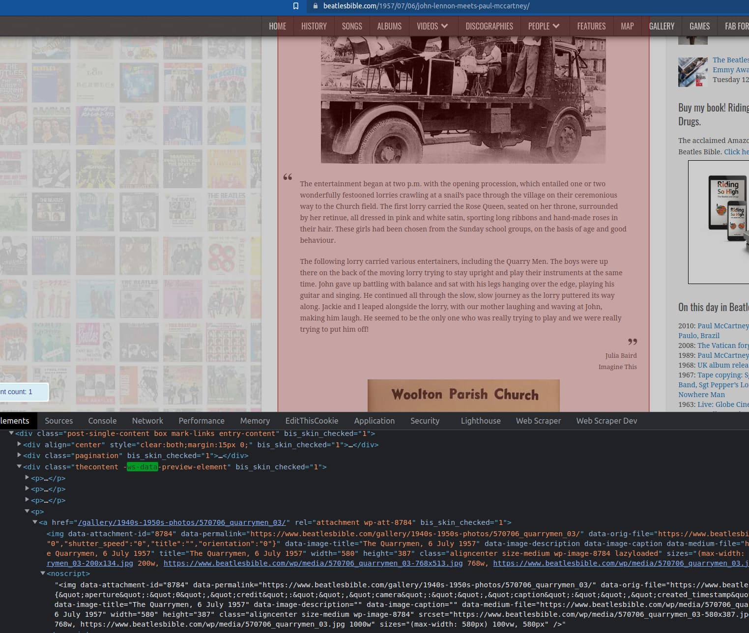 {"_id":"test-text","startUrl":["https://www.beatlesbible.com/1957/07/06/john-lennon-meets-paul-mccartney/"],"selectors":[{"id":"Content","multiple":false,"parentSelectors":["_root"],"regex":"","selector":"div.thecontent","type":"SelectorText"}]}