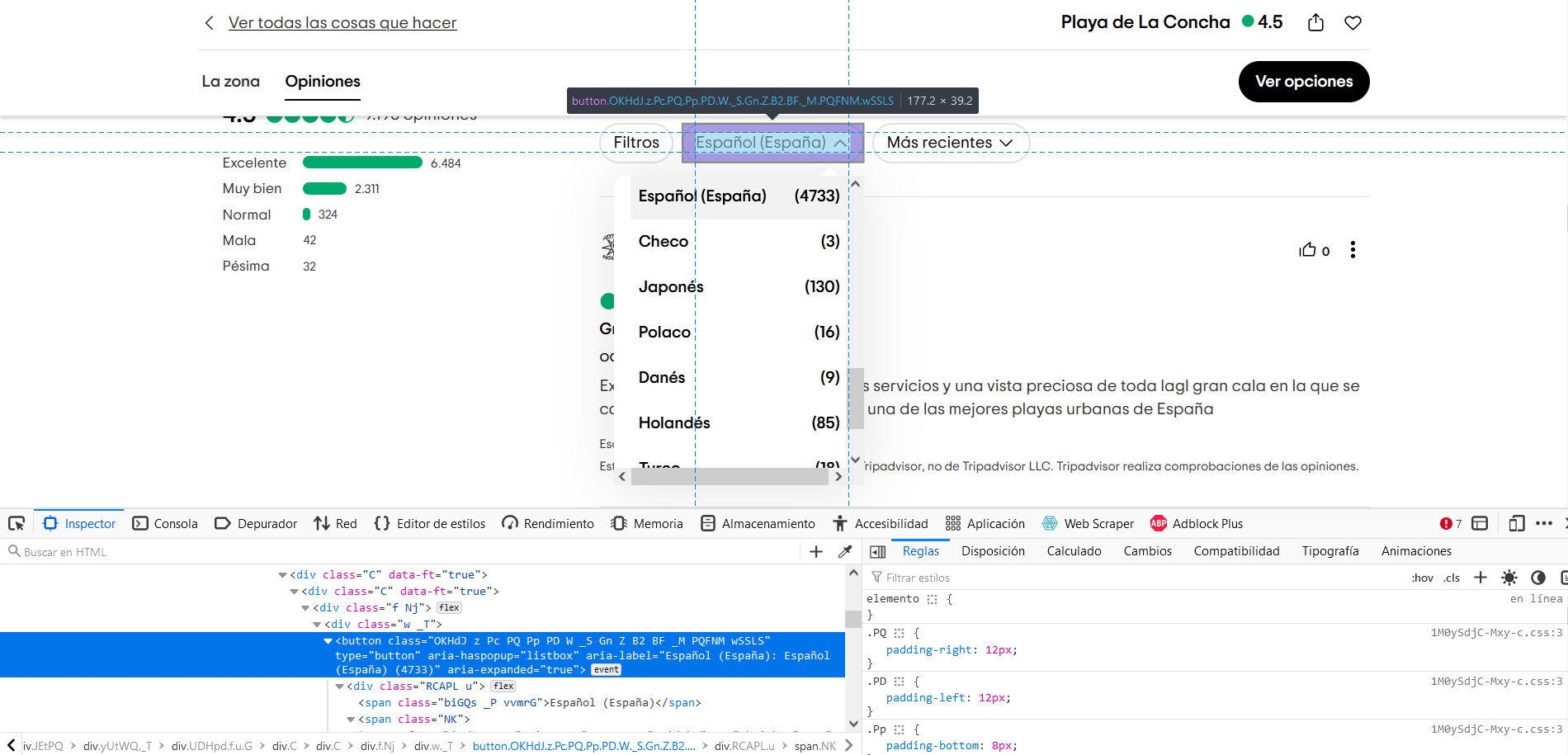 But when it comes to make the scraper go through several location links (https://www.tripadvisor.es/Attractions-g187457-Activities-oa0-San_Sebastian_Donostia_Province_of_Guipuzcoa_Basque_Country.html) it doesn’t work due to the dropdown button selector being different for each one (it is dependant of the number of reviews in your language – Spanish in my case, you can see the 4733 above).